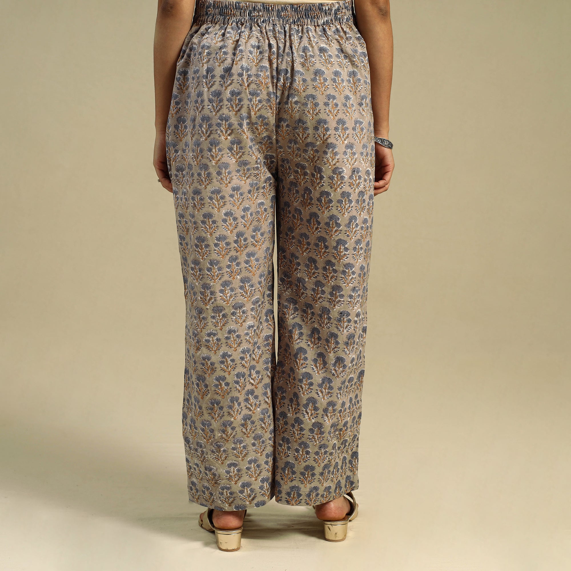 | Material | Crafted using traditional sanganeri hand block printing from Rajasthan, this brown cotton palazzo offers breathable comfort and everyday elegance. Designed with soft cotton fabric, it features an elasticated waistband and two side pockets for ease. Ideal for daily wear or relaxed festive styling, it brings a touch of cultural charm to your wardrobe. |