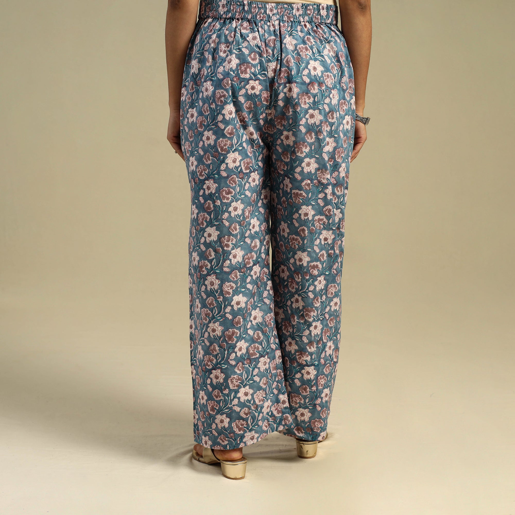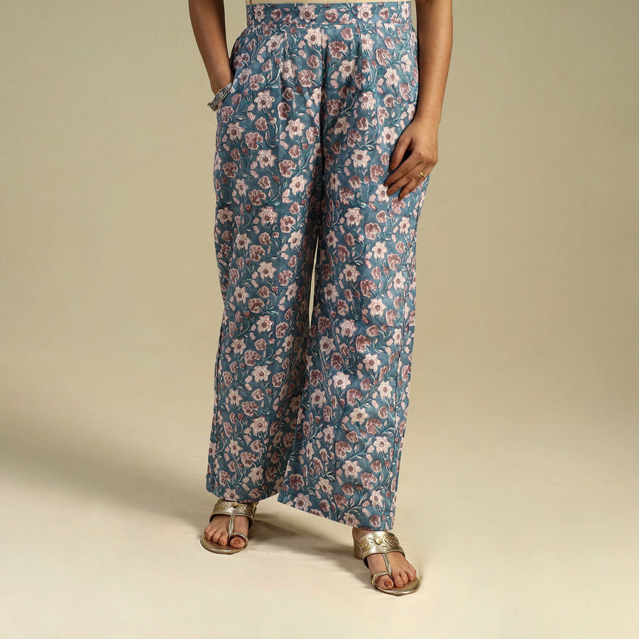 Crafted using traditional sanganeri hand block printing from Rajasthan, this blue cotton palazzo offers breathable comfort and everyday elegance. Designed with soft cotton fabric, it features an elasticated waistband and two side pockets for ease. Ideal for daily wear or relaxed festive styling, it brings a touch of cultural charm to your wardrobe.