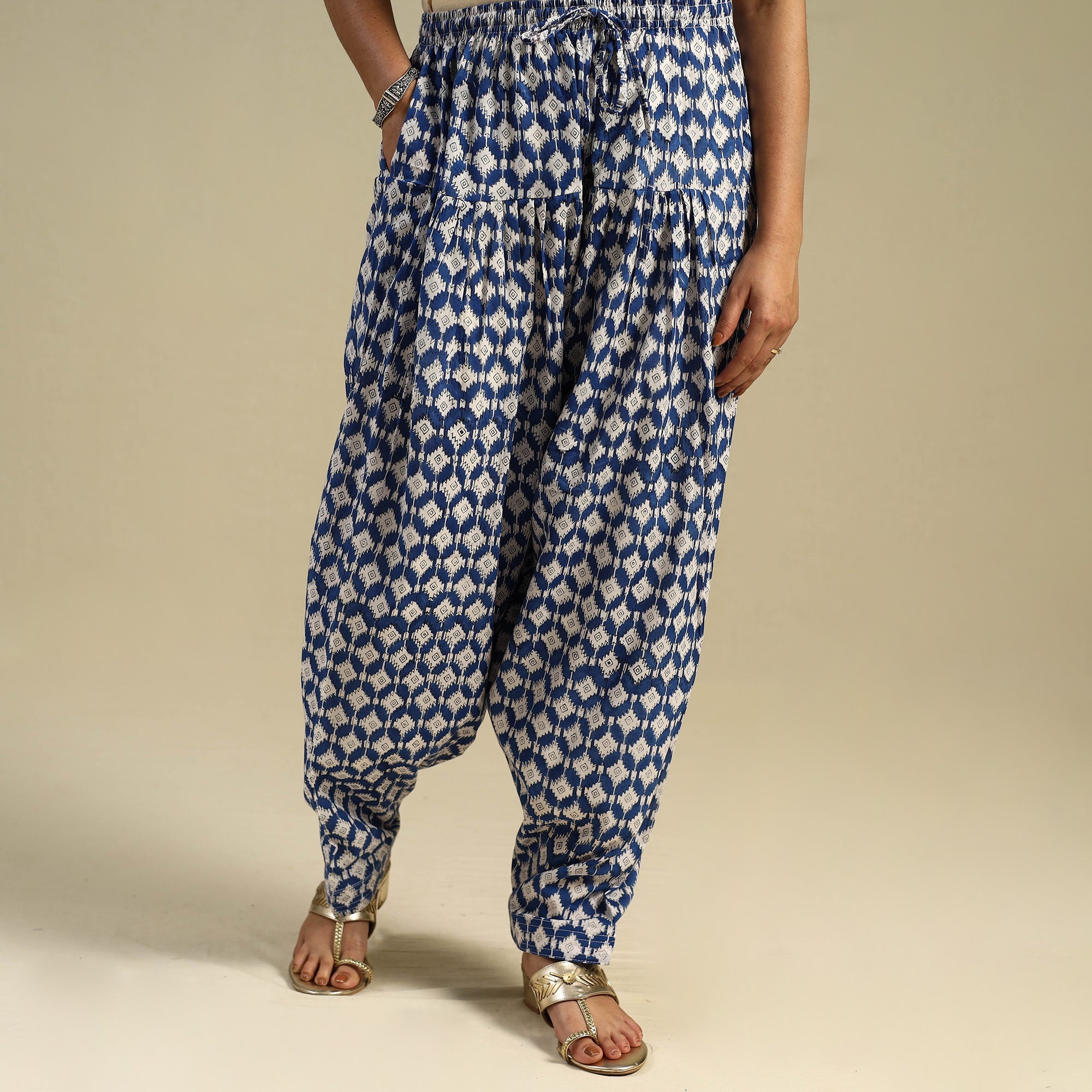 This blue cotton sanganeri salwar is crafted using traditional hand block printing techniques from Rajasthan. It features soft, breathable cotton fabric, an elasticated waistband with a drawstring, and a handy side pocket. Comfortable and rich in cultural charm, this salwar is ideal for everyday outings or laid-back festive wear.