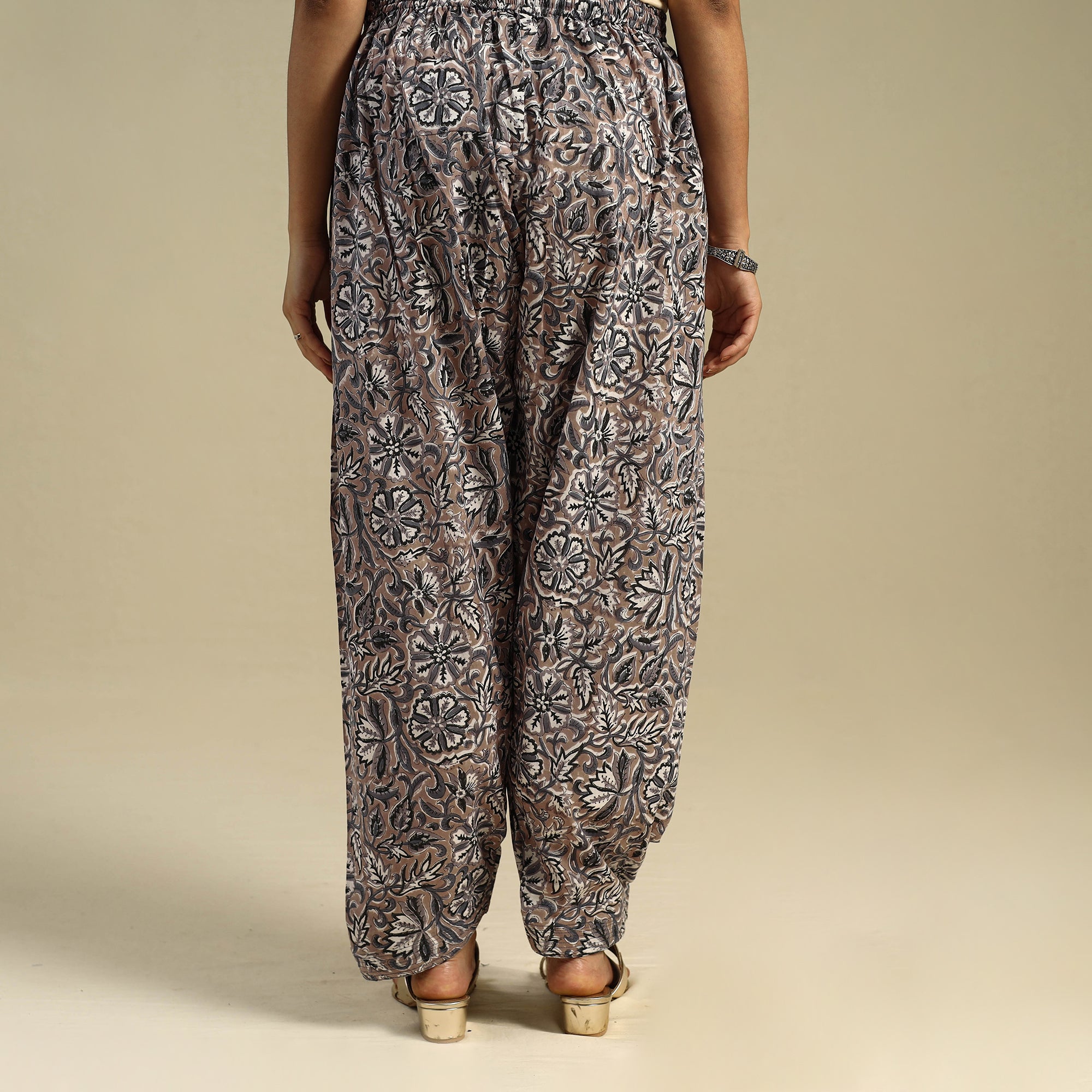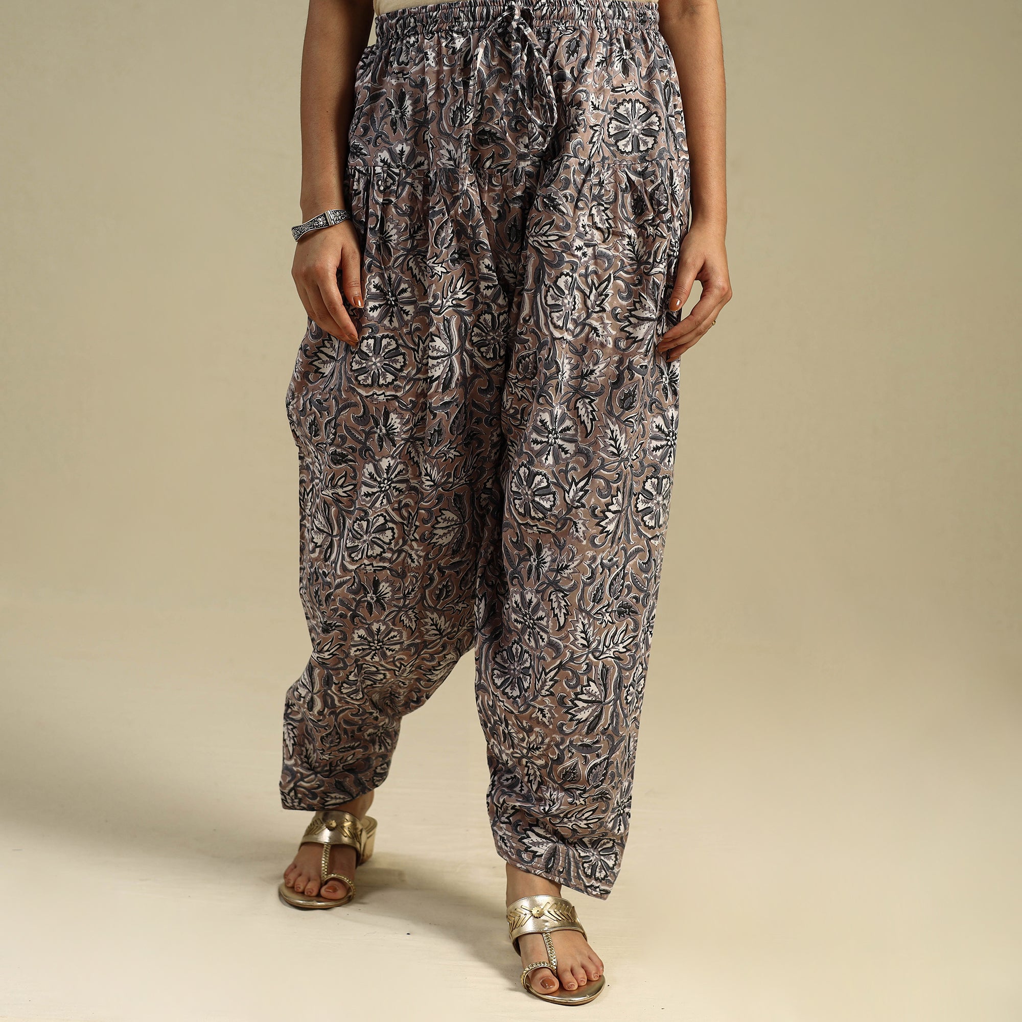 | Material | This brown cotton sanganeri salwar is crafted using traditional hand block printing techniques from Rajasthan. It features soft, breathable cotton fabric, an elasticated waistband with a drawstring, and a handy side pocket. Comfortable and rich in cultural charm, this salwar is ideal for everyday outings or laid-back festive wear. |