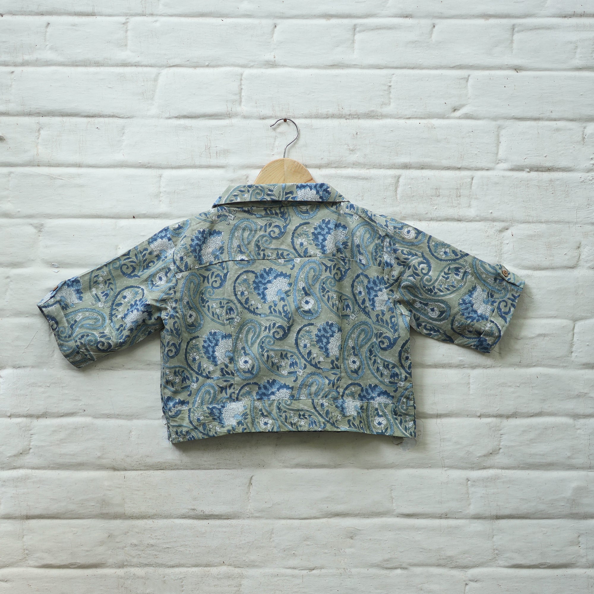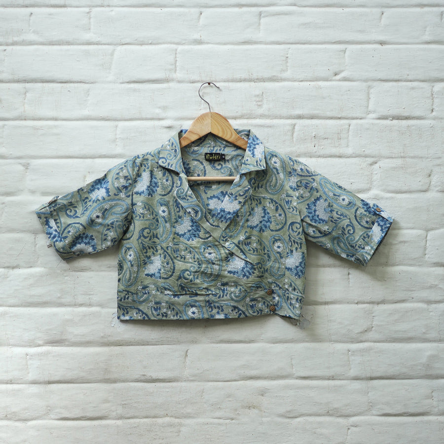 This green stitched cotton blouse showcases traditional sanganeri block printing, known for its fine floral motifs. Made from breathable cotton, the blouse features half sleeves and a relaxed fit, ideal for long wear. It's a versatile addition to any wardrobe, ideal for both casual and formal occasions.