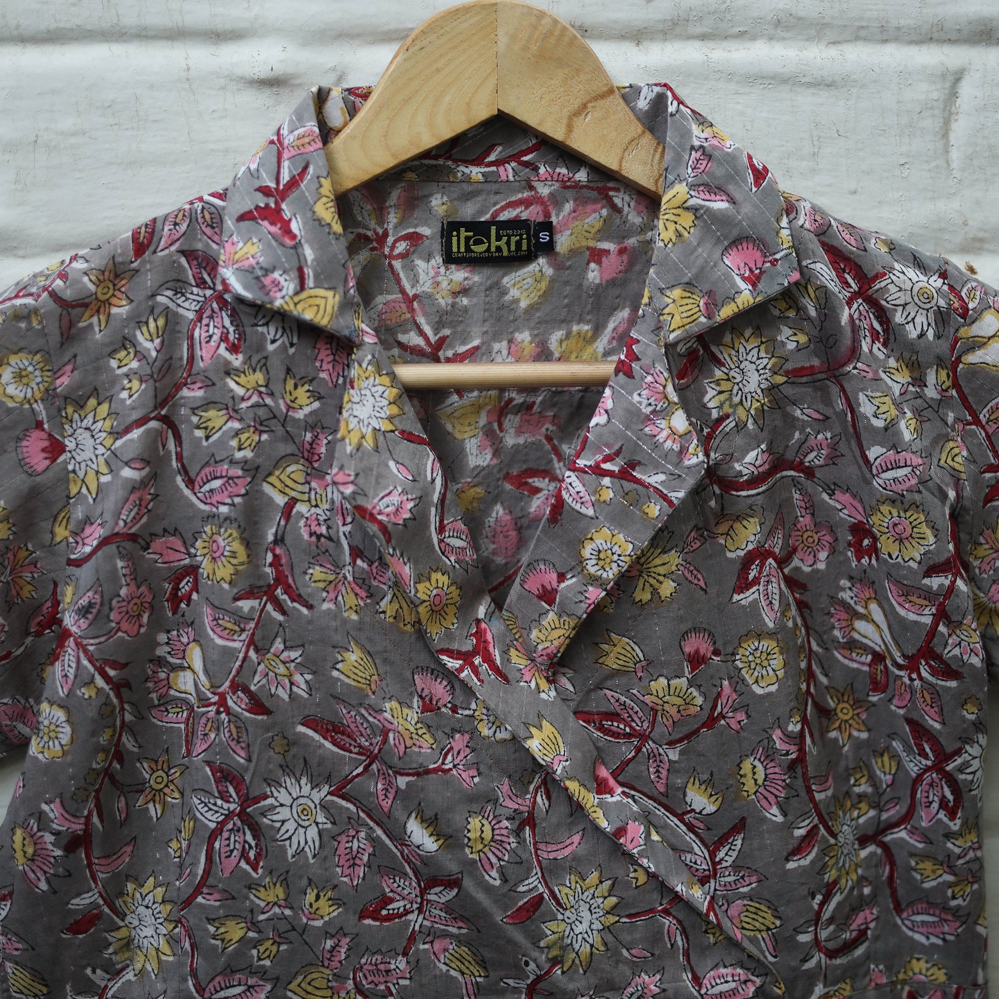 This grey stitched cotton blouse showcases traditional sanganeri block printing, known for its fine floral motifs. Made from breathable cotton, the blouse features half sleeves and a relaxed fit, ideal for long wear. It's a versatile addition to any wardrobe, ideal for both casual and formal occasions.