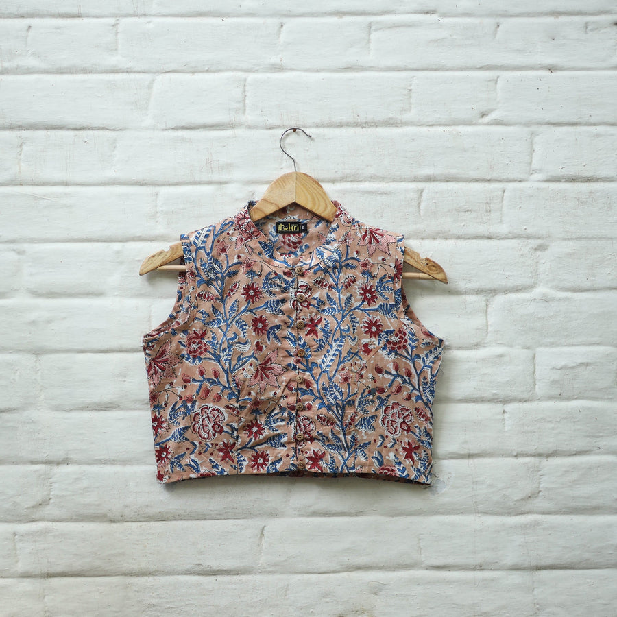 This brown stitched cotton blouse showcases traditional sanganeri block printing, known for its fine floral motifs. Made from breathable cotton, the blouse features a sleeveless cut and a relaxed fit for all-day comfort. The front is finished with wooden button closures, adding a natural touch to the design. It's a versatile addition to any wardrobe, ideal for both casual and formal occasions.
