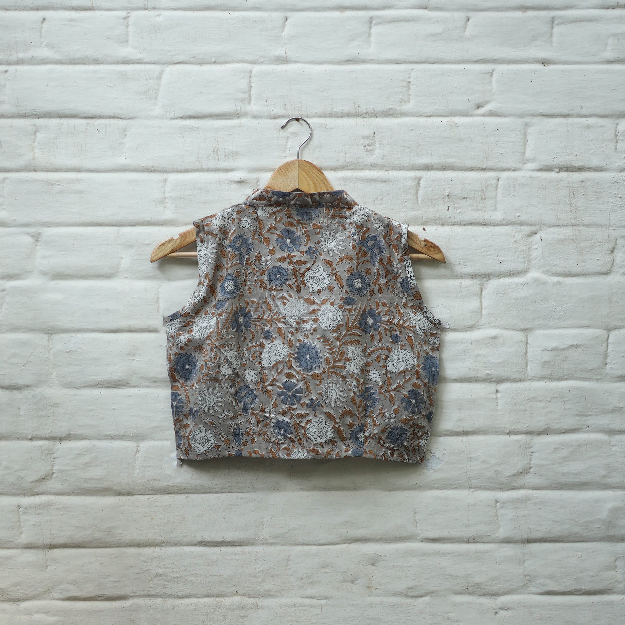 This grey stitched cotton blouse showcases traditional sanganeri block printing, known for its fine floral motifs. Made from breathable cotton, the blouse features a sleeveless cut and a relaxed fit for all-day comfort. The front is finished with wooden button closures, adding a natural touch to the design. It's a versatile addition to any wardrobe, ideal for both casual and formal occasions.
