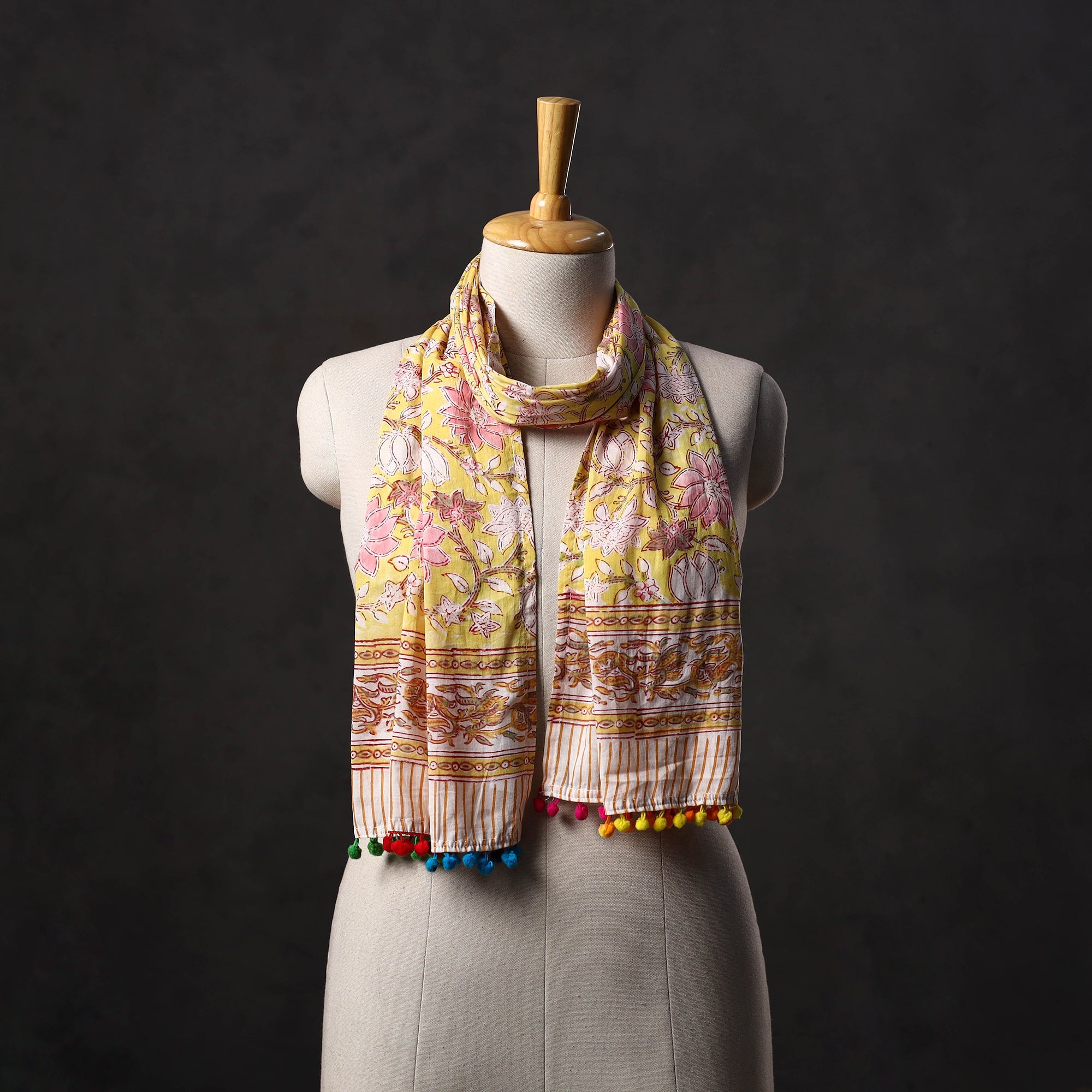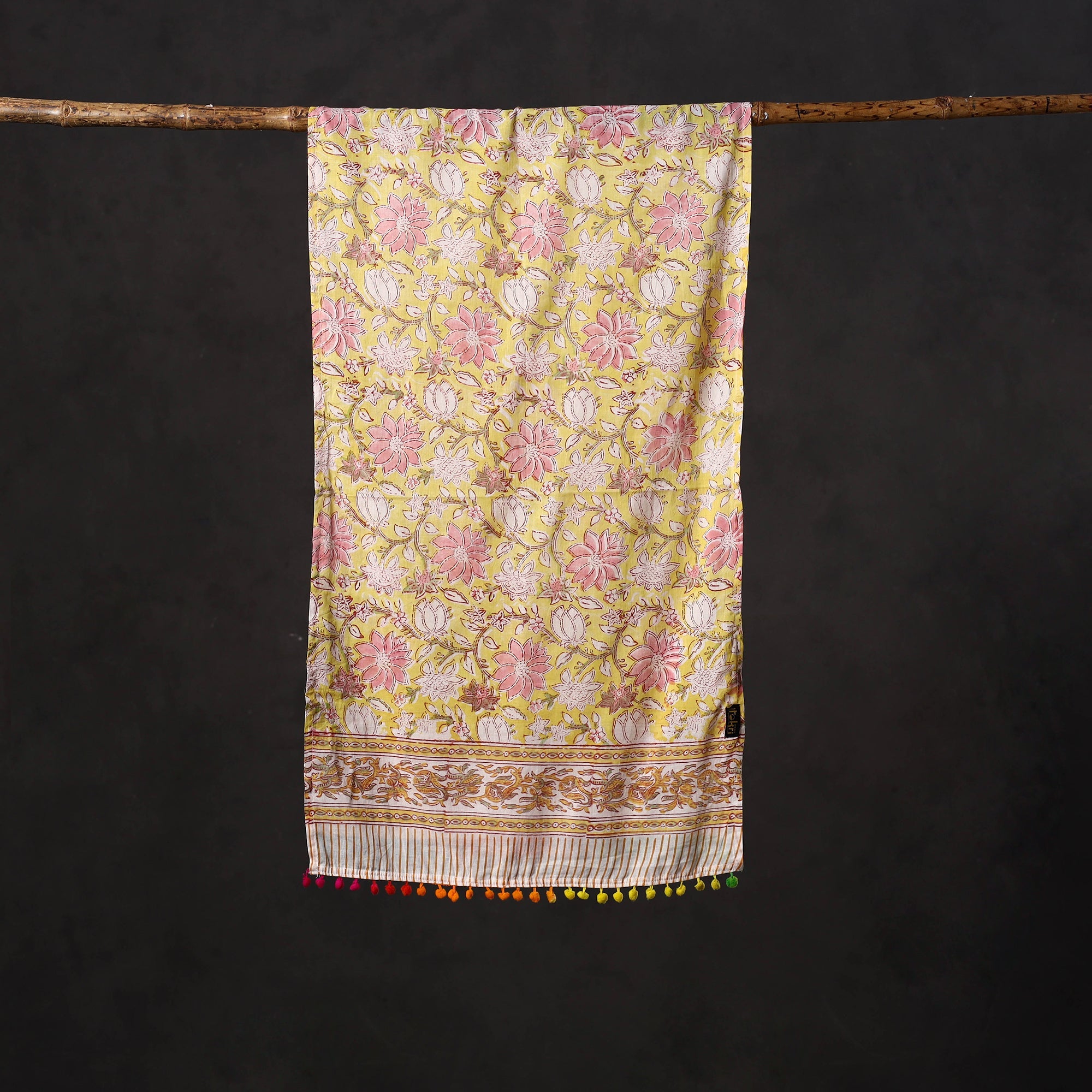 Traditional sanganeri hand block printed stole is adorned with intricate floral motifs, known as ‘buttas.’ It showcases the rich cultural heritage of Sanganer, Rajasthan and is crafted using VAT dyes to ensure vibrant, long-lasting colors. Made from soft breathable cotton with delicate pom-pom detailing, this stole offers a perfect blend of style and comfort, making it ideal for both everyday wear and special occasions.