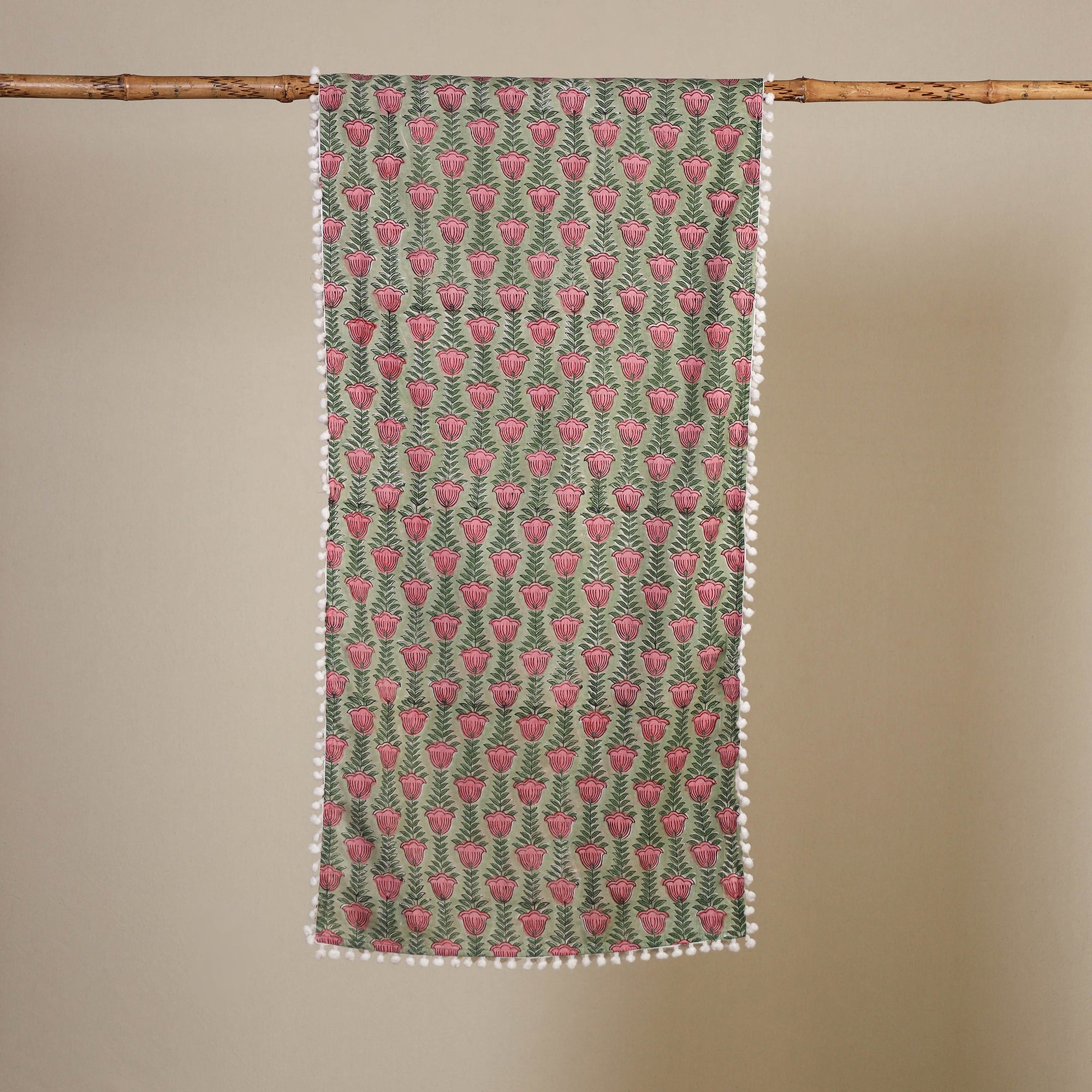 Crafted by artisans in Sanganer, Rajasthan, this green cotton stole showcases hand block printing using traditional methods. Featuring floral motifs and pom-poms, it adds grace to both everyday and festive wear. Made from breathable cotton, it blends comfort with the charm of Indian textile art.
