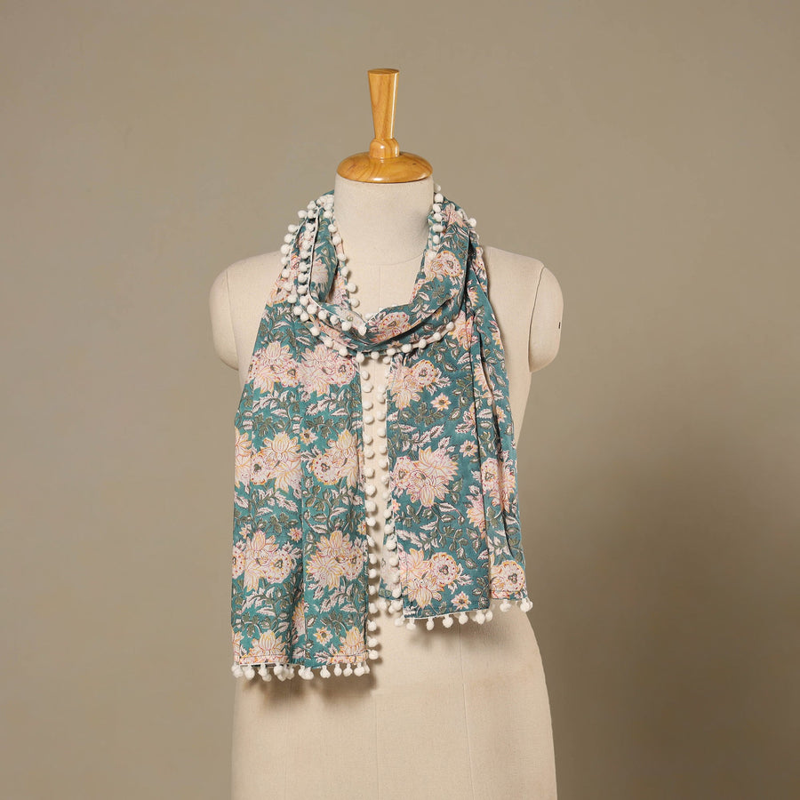 This blue cotton stole is beautifully hand block-printed using traditional techniques by skilled artisans from Sanganer, Rajasthan. It features floral motifs and pom-poms, adding grace to both everyday and festive wear. Made from breathable cotton, it blends comfort with the charm of Indian textile art.