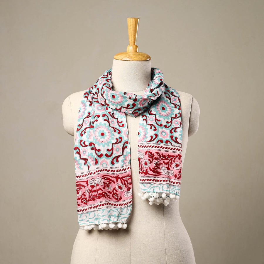 Experience the timeless elegance of a traditional block print cotton blue Sanganeri stole, adorned with intricate floral motifs, known as 'Buttas.' This exquisite piece showcases the rich cultural heritage of Sanganer, Rajasthan, and is meticulously crafted using VAT dyes to ensure vibrant, long-lasting colors. Made from soft, breathable cotton with delicate pom-pom detailing, this stole is a perfect blend of style and comfort, ideal for both everyday wear and special occasions