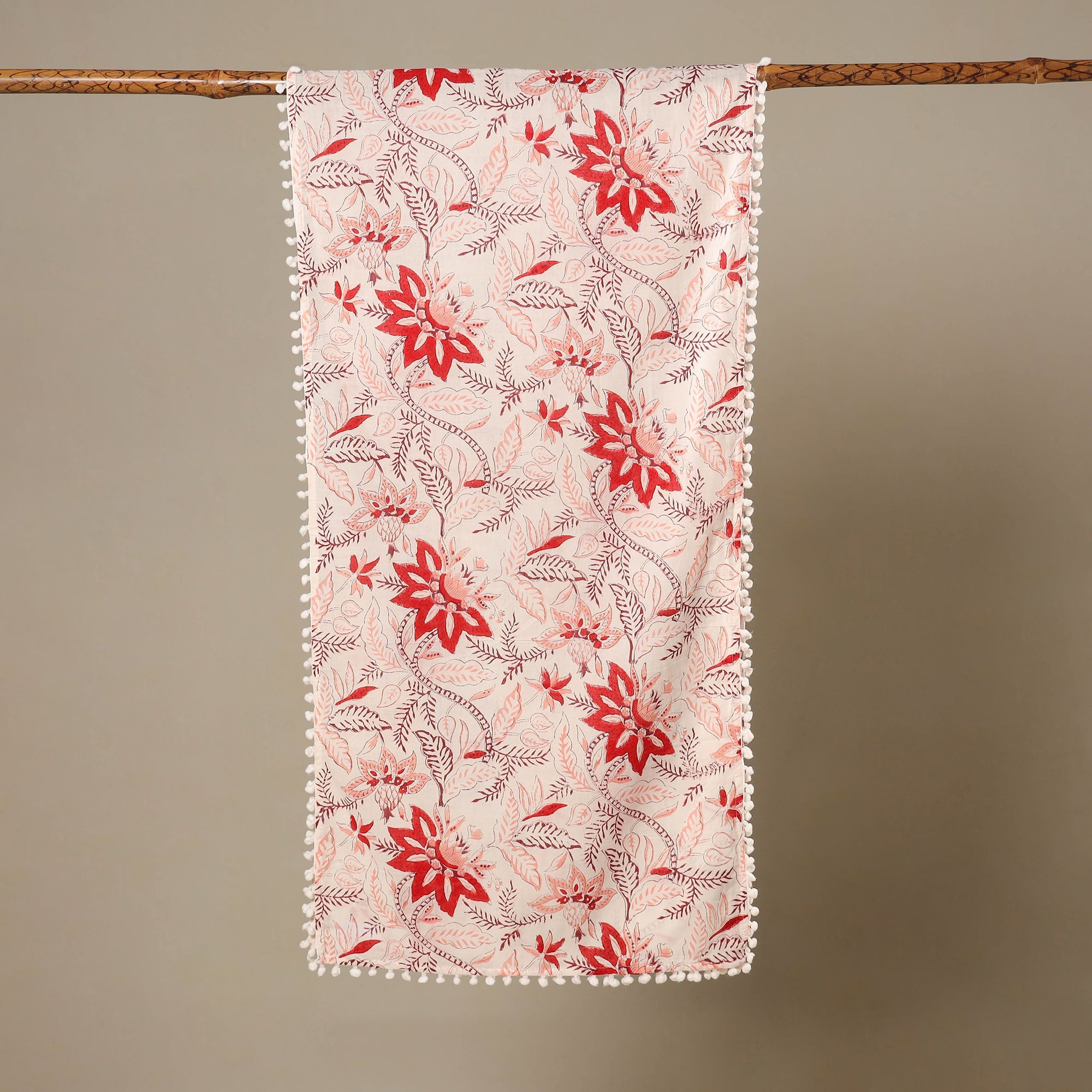 This white cotton stole is beautifully hand block-printed using traditional techniques by skilled artisans from Sanganer, Rajasthan. It features floral motifs and pom-poms, adding grace to both everyday and festive wear. Made from breathable cotton, it blends comfort with the charm of Indian textile art.