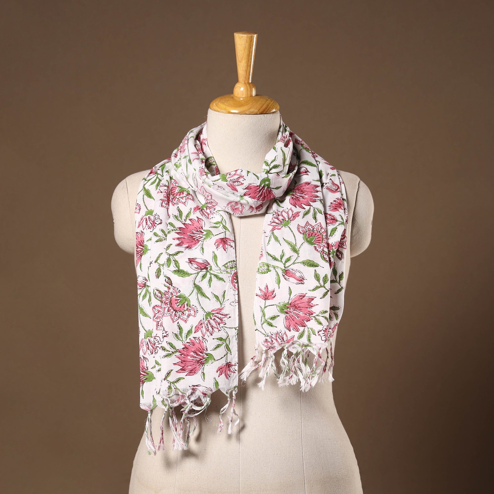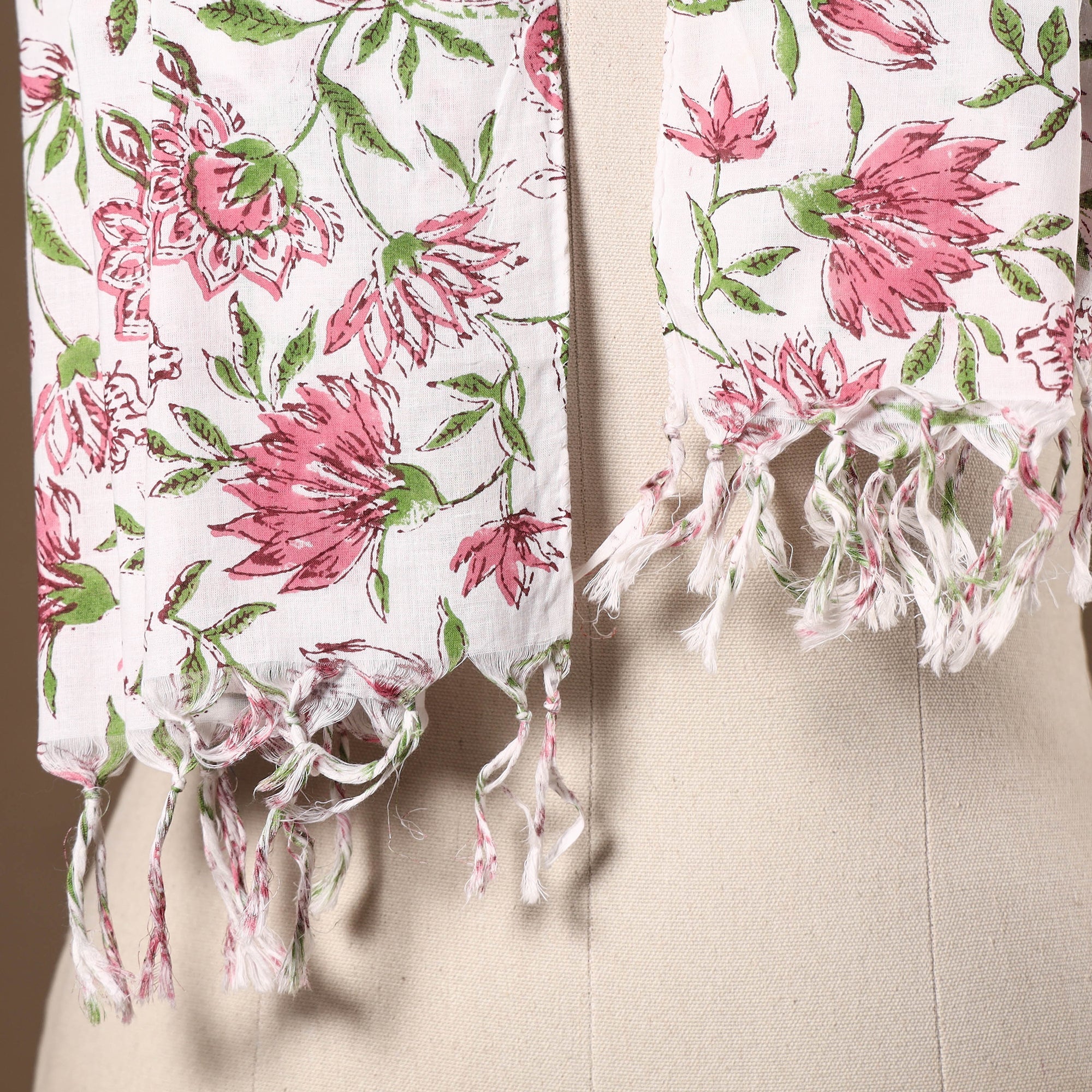 White - Block Print Cotton Sanganeri Stole with Tassels 05