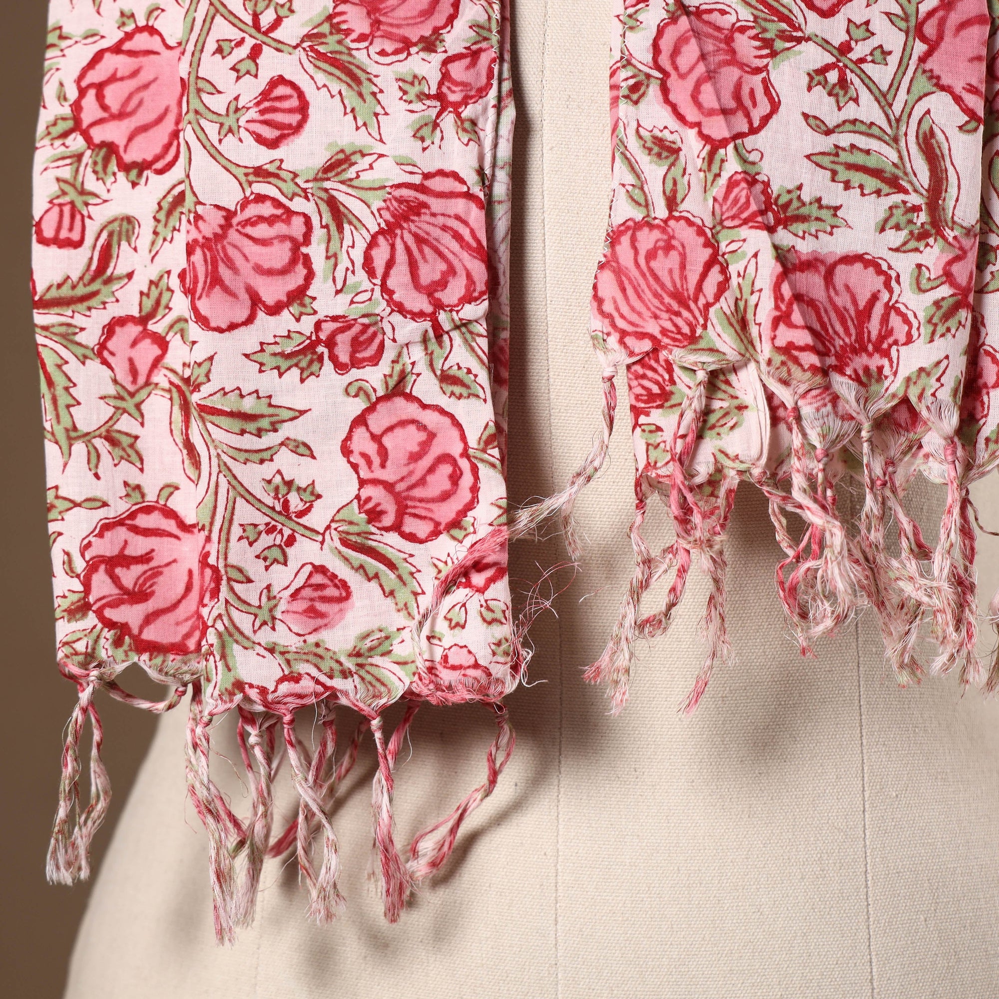 This pink sanganeri stole celebrates the age-old charm of Rajasthan’s block printing. Made from soft cotton and dyed using durable VAT colors, it features delicate floral prints and tassels that add a graceful flair. Blending tradition with comfort, it is ideal for daily wear or special moments. Hand-printed by skilled artisans of Sanganer, this piece brings local heritage yahan into your style.