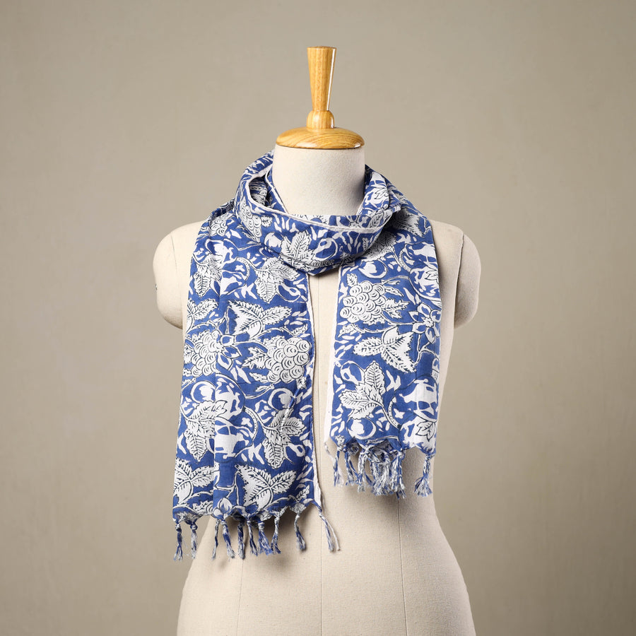 Embrace the elegance of a traditional block print cotton blue sanganeri stole with tassels. Featuring delicate floral patterns known as 'Buttas,' this piece reflects the rich cultural heritage of Sanganer, Rajasthan. Crafted using VAT dyes, it ensures vibrant and lasting colors. The soft, breathable cotton makes it perfect for daily wear or special occasions.