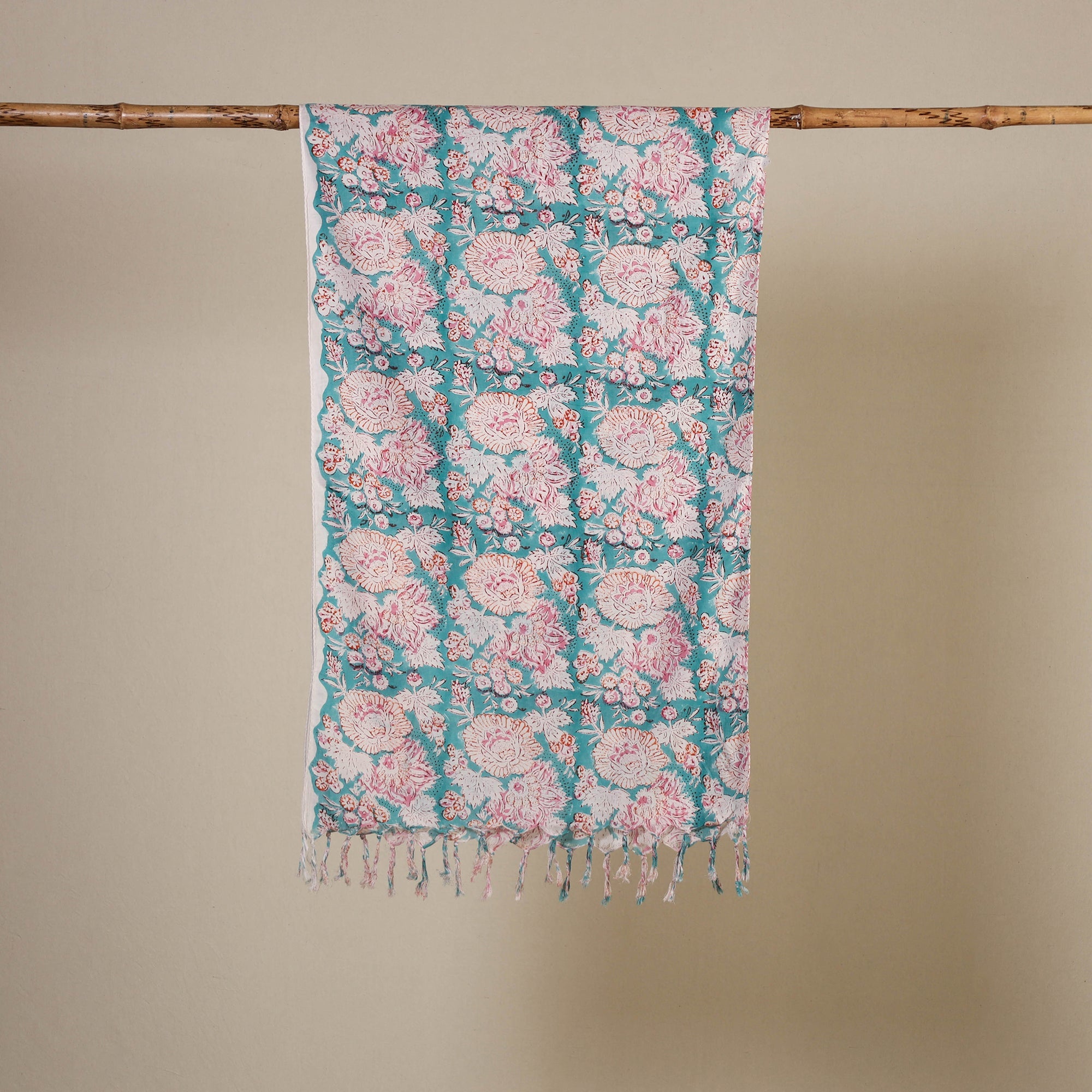 Crafted by artisans in Sanganer, Rajasthan, this blue cotton stole features traditional hand block printing techniques. Adorned with floral motifs and delicate tassels, it brings elegance to both everyday and festive wear. Made from breathable cotton, it combines comfort with the timeless beauty of Indian textile traditions.