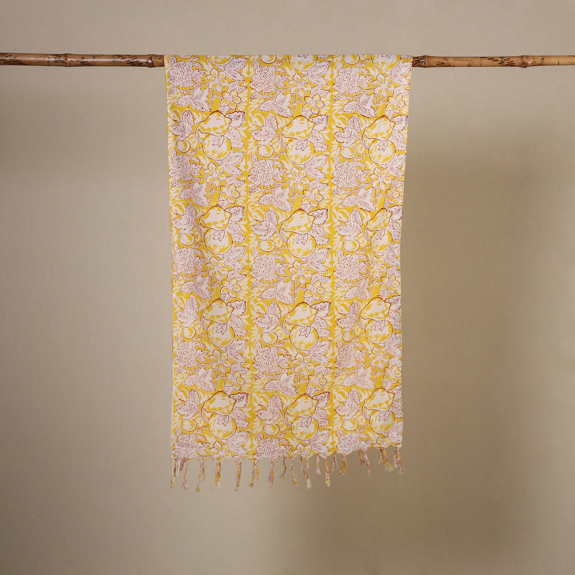 Crafted by artisans in Sanganer, Rajasthan, this yellow cotton stole features traditional hand block printing techniques. Adorned with floral motifs and delicate tassels, it brings elegance to both everyday and festive wear. Made from breathable cotton, it combines comfort with the timeless beauty of Indian textile traditions.