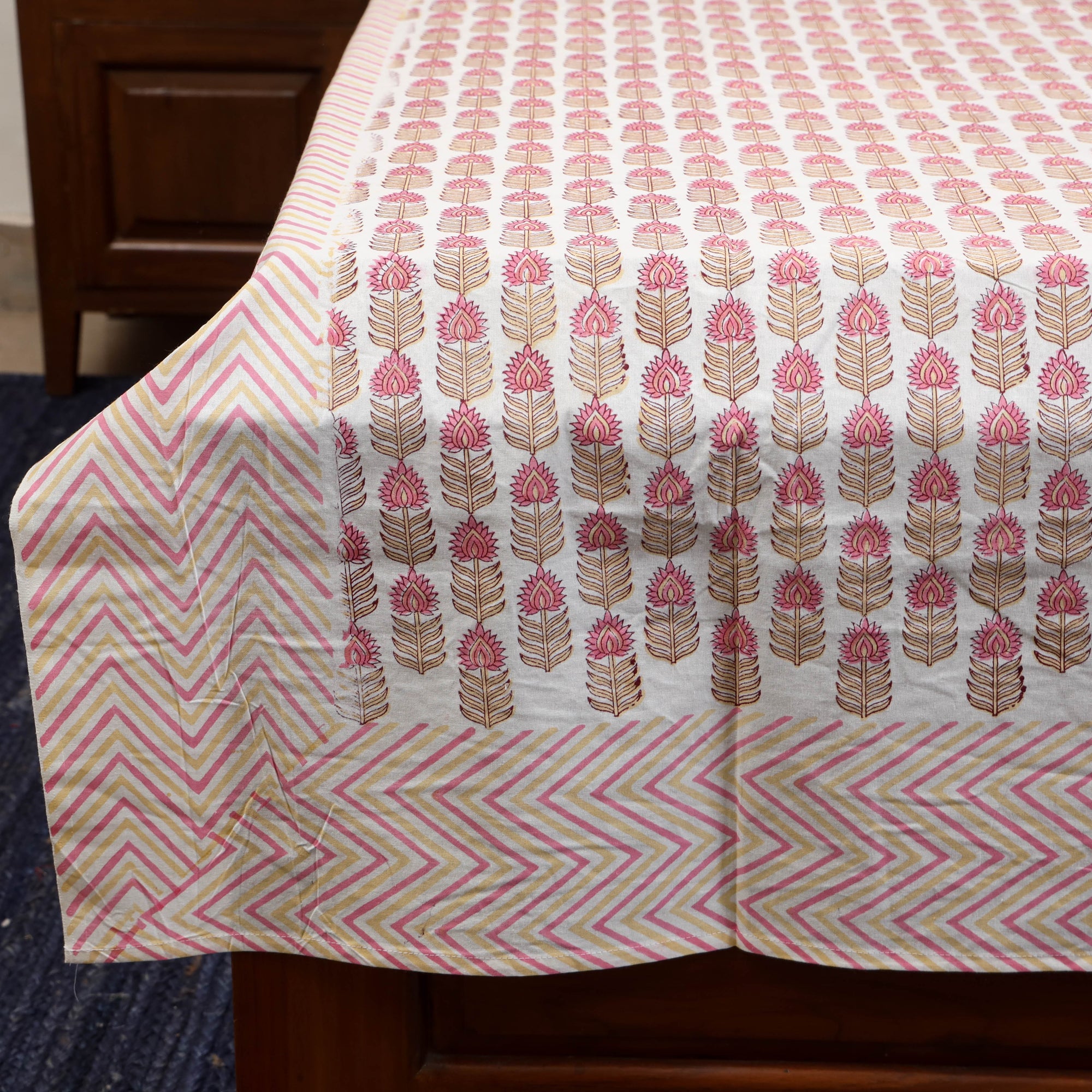 Sanganeri print cotton bed sheet, crafted by artisans of Rajasthan. Made using hand block printing techniques with bleed-free VAT dyes it ensures long-lasting vibrancy. Adorned with floral motifs this single bed sheet is suitable for everyday use.