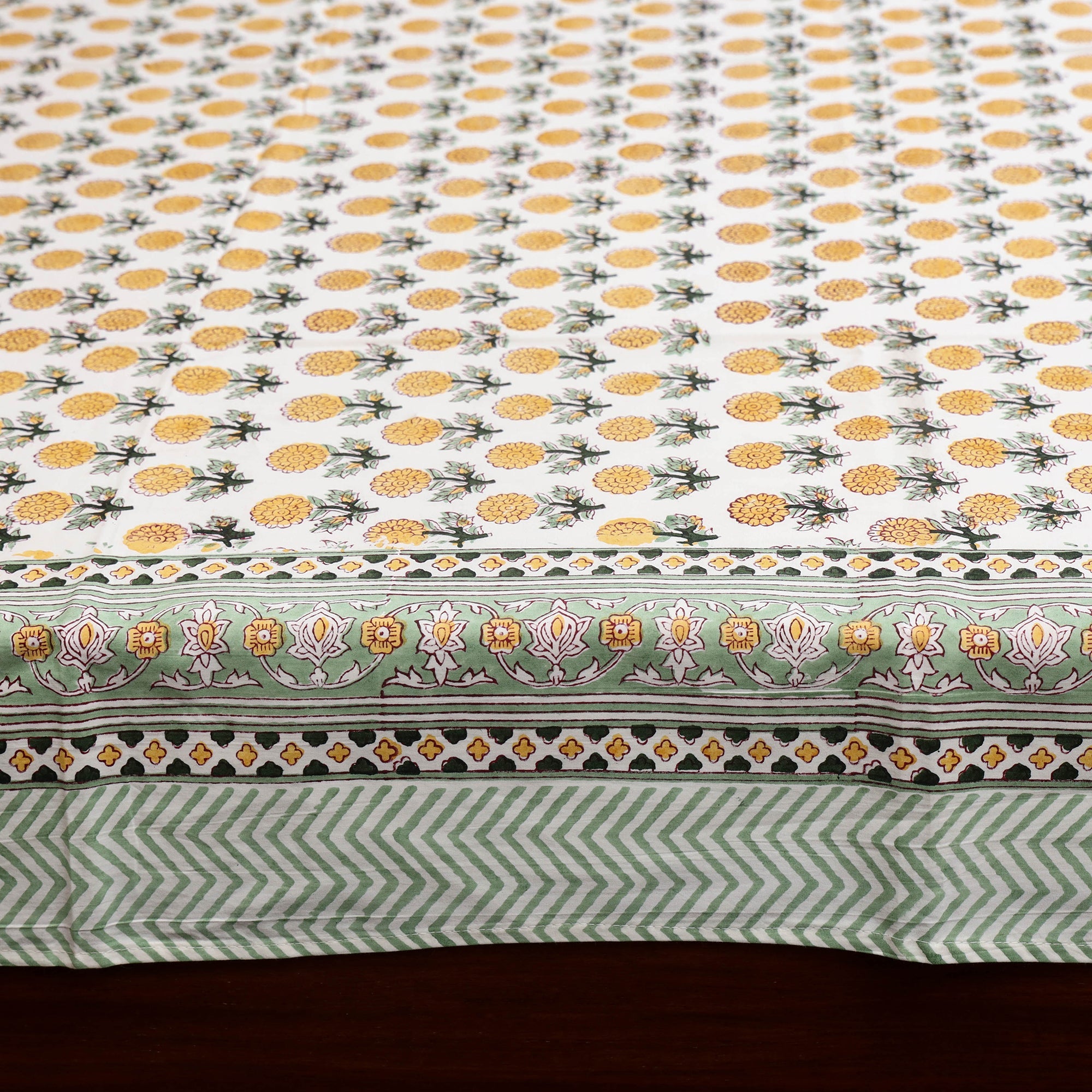 Sanganeri print cotton bed sheet, crafted by artisans of Rajasthan. Made using hand block printing techniques with bleed-free VAT dyes it ensures long-lasting vibrancy. Adorned with floral motifs this single bed sheet is suitable for everyday use.