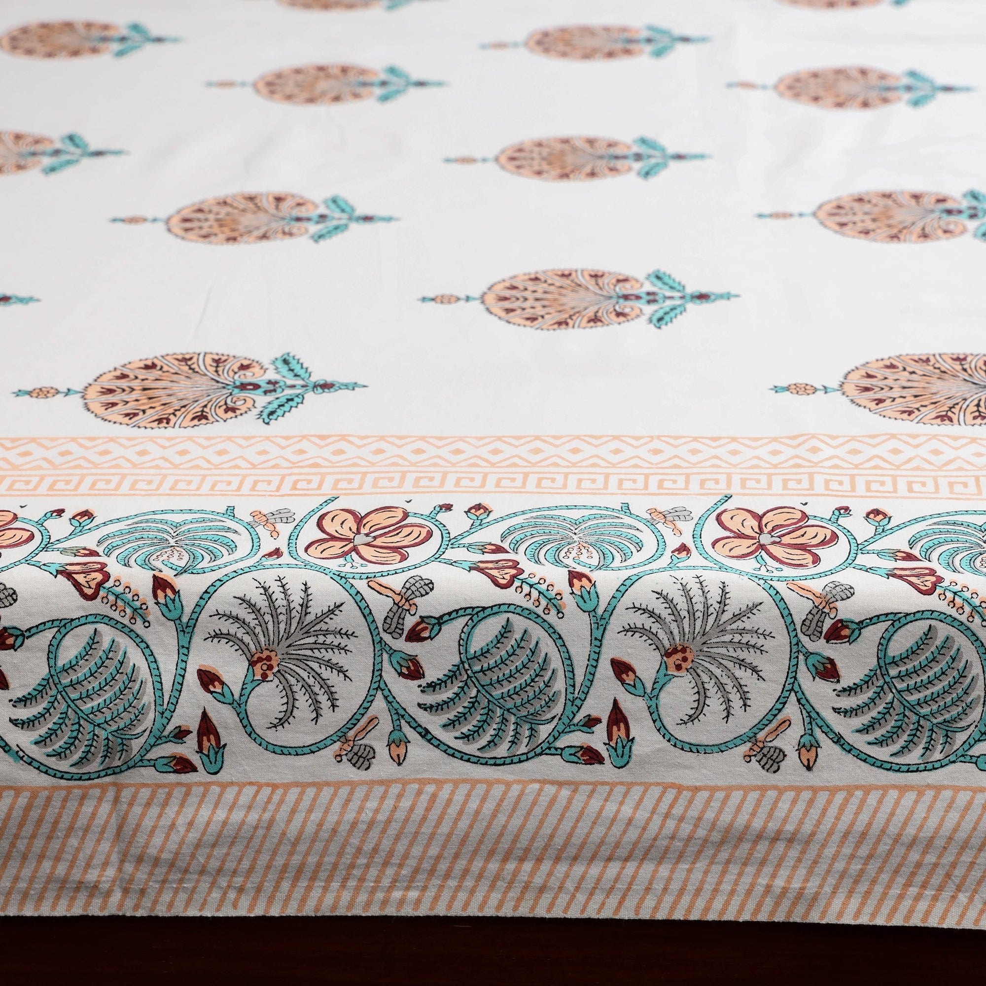 Sanganeri print cotton bed sheet, crafted by artisans of Rajasthan. Made using hand block printing techniques with bleed-free VAT dyes it ensures long-lasting vibrancy. Adorned with floral motifs this single bed sheet is suitable for everyday use.