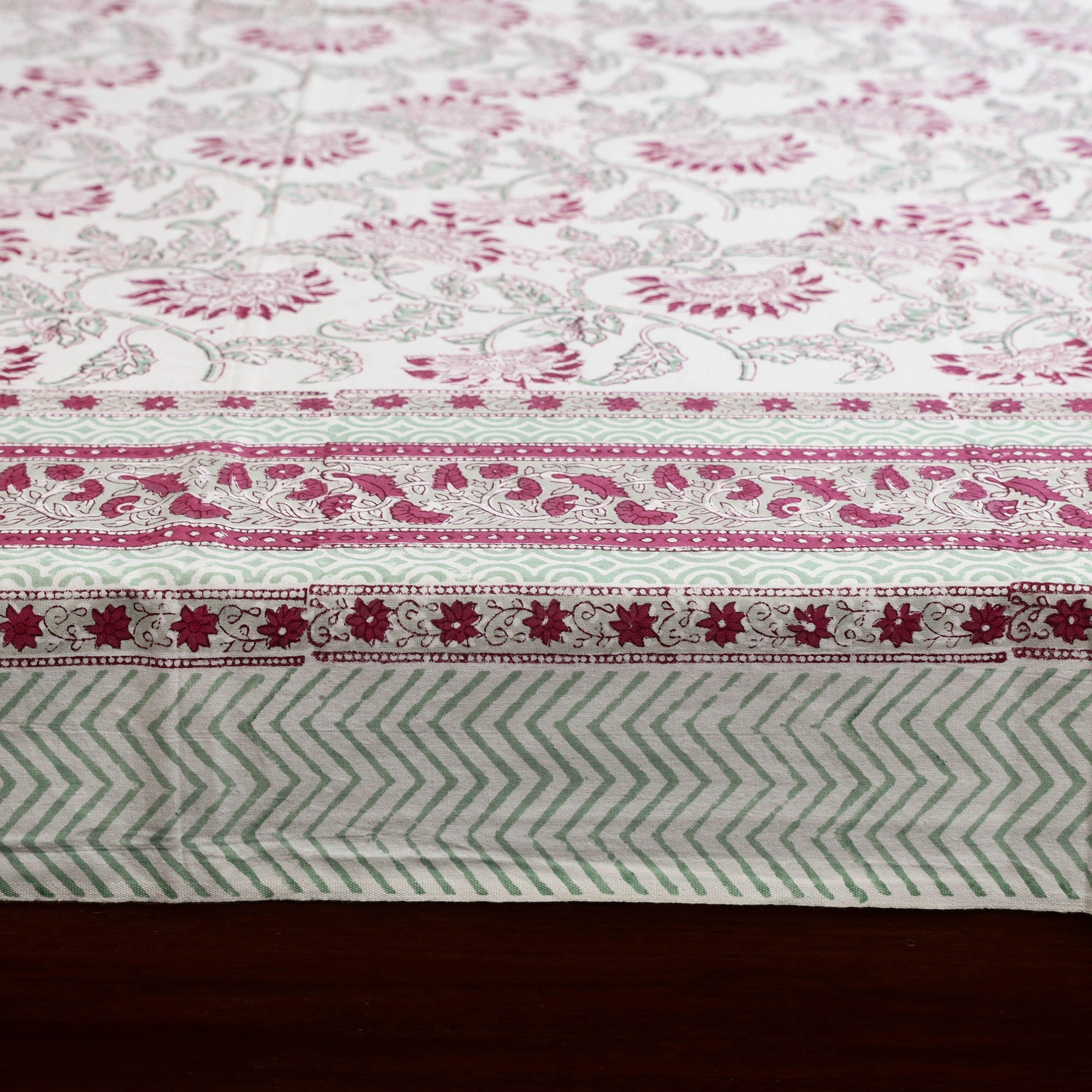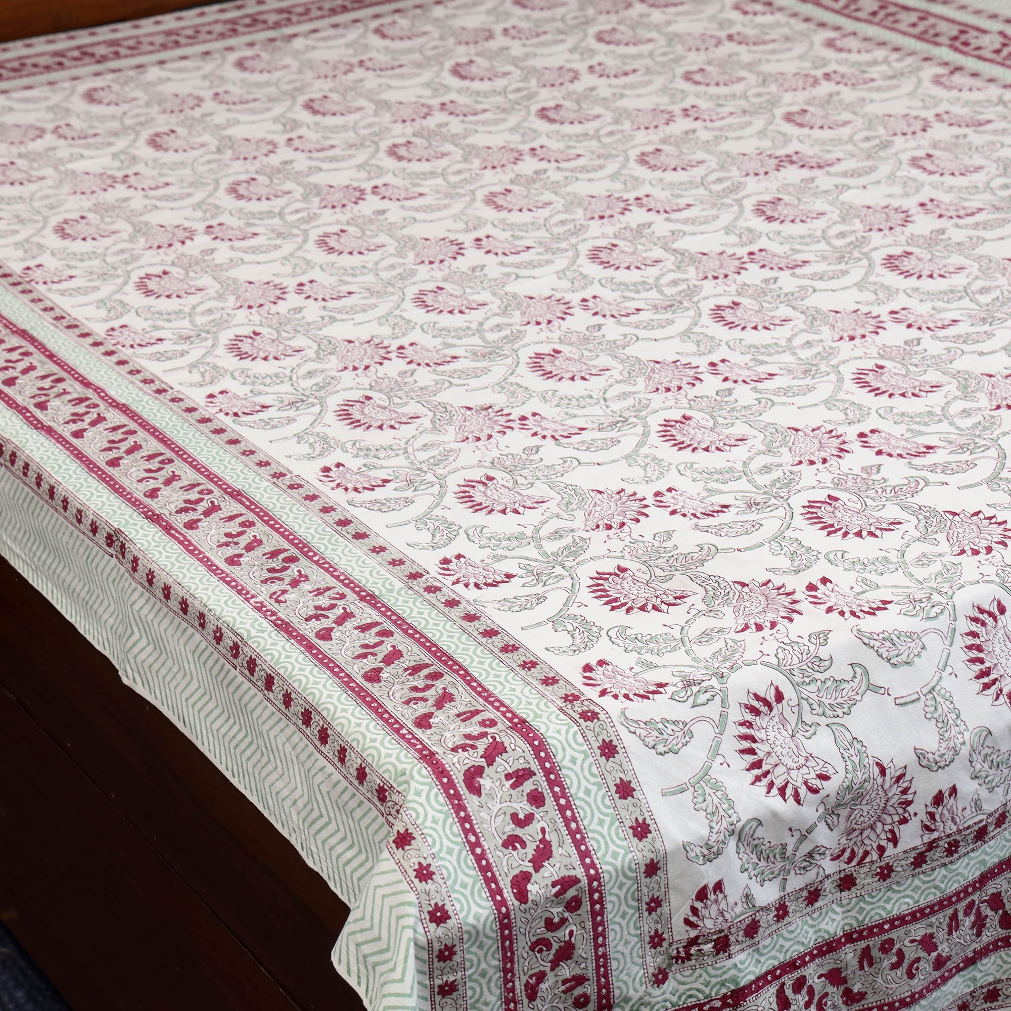 Sanganeri print cotton bed sheet, crafted by artisans of Rajasthan. Made using hand block printing techniques with bleed-free VAT dyes it ensures long-lasting vibrancy. Adorned with floral motifs this single bed sheet is suitable for everyday use.
