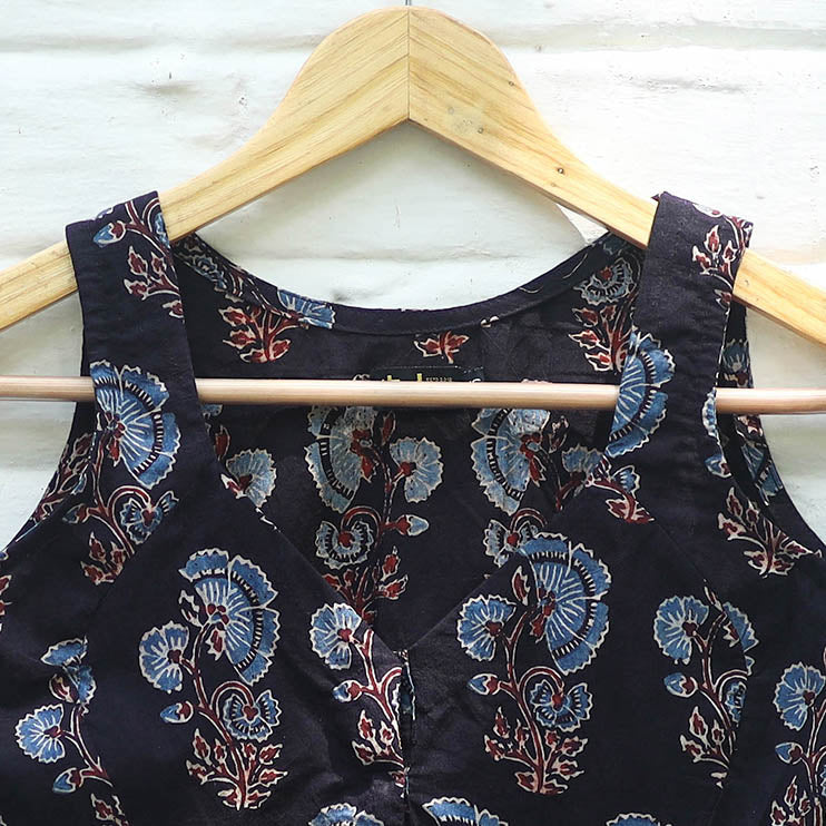 Elevate your style with this black cotton ajrakh stitched blouse, adorned with authentic hand-block prints created from natural dyes. Carefully handcrafted by skilled artisans, it offers breathable comfort with its sleeveless design and secure hook fastening. A versatile addition to your wardrobe, it pairs beautifully with sarees or skirts for a timeless ethnic charm.