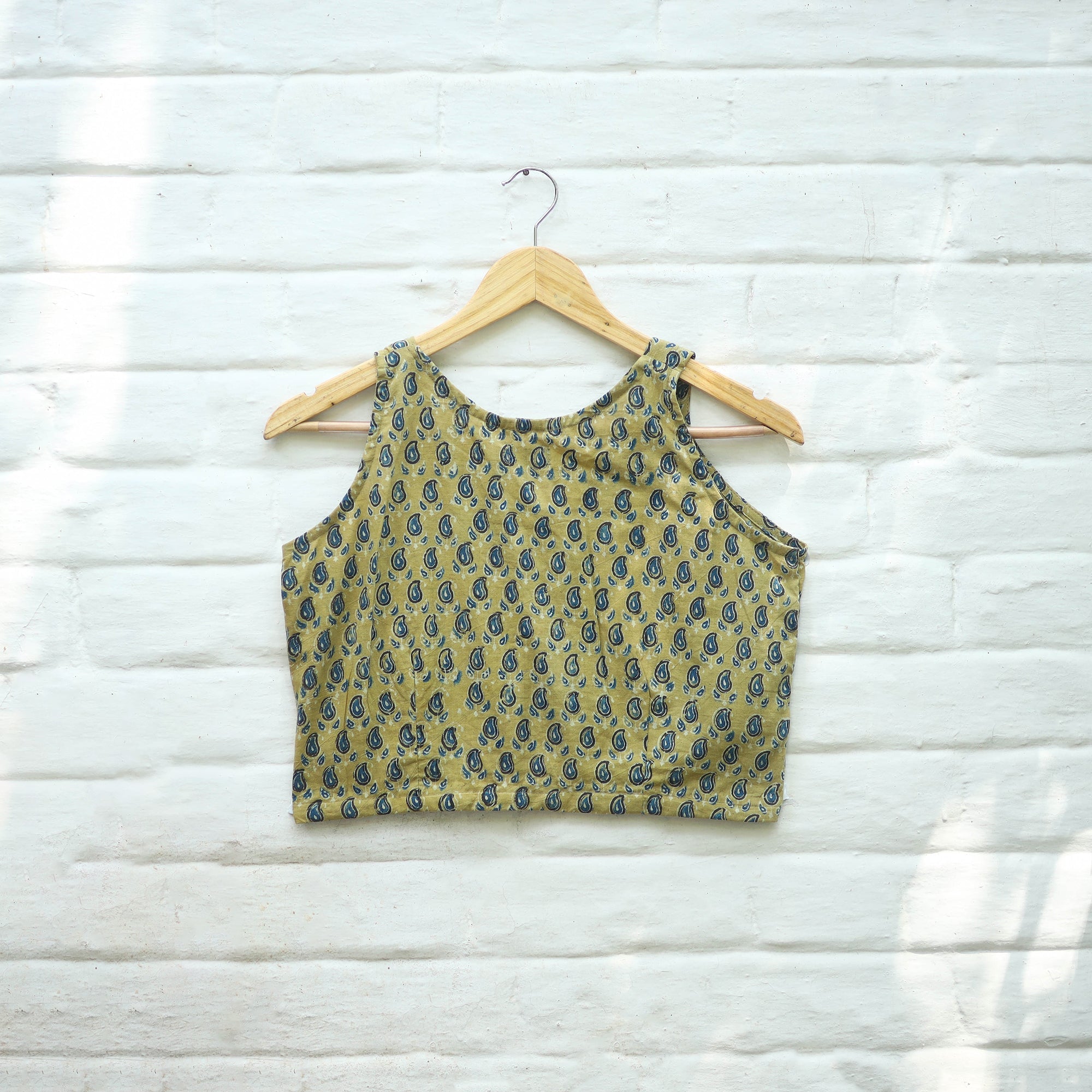 Elevate your style with this yellow cotton ajrakh stitched blouse, adorned with authentic hand-block prints created from natural dyes. Carefully handcrafted by skilled artisans, it offers breathable comfort with its sleeveless design and secure hook fastening. A versatile addition to your wardrobe, it pairs beautifully with sarees or skirts for a timeless ethnic charm.