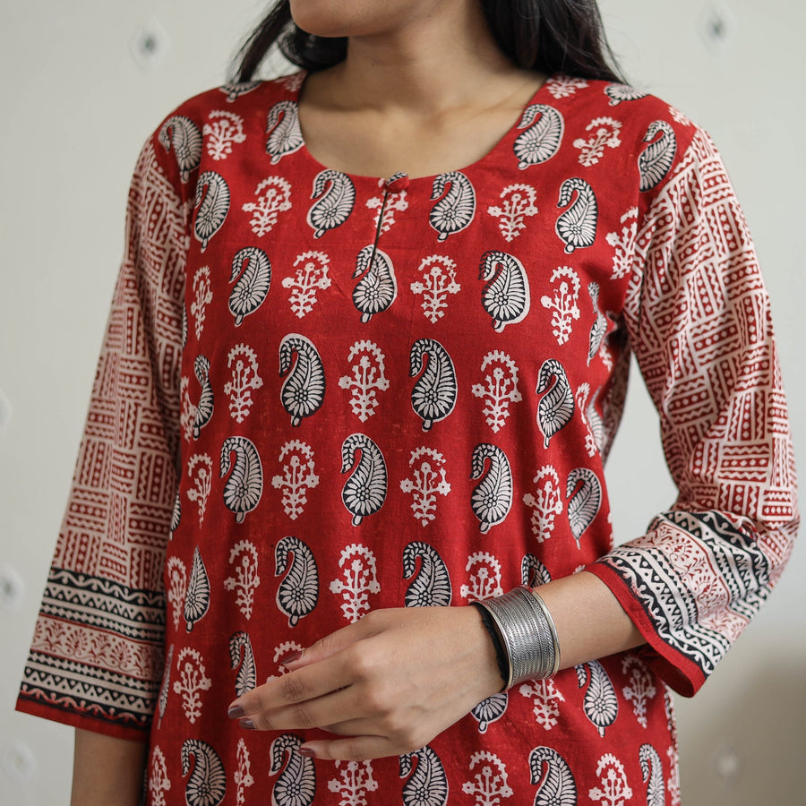 This red block print cotton straight bagh kurta brings together the traditional art of Bagh block printing and modern design. Made from natural dyed cotton, this kurta is soft on your skin and eco-friendly. It features a straight fit and a practical one-side pocket for convenience. Whether for a daily outing or a special event, this kurta offers the perfect blend of comfort and style.