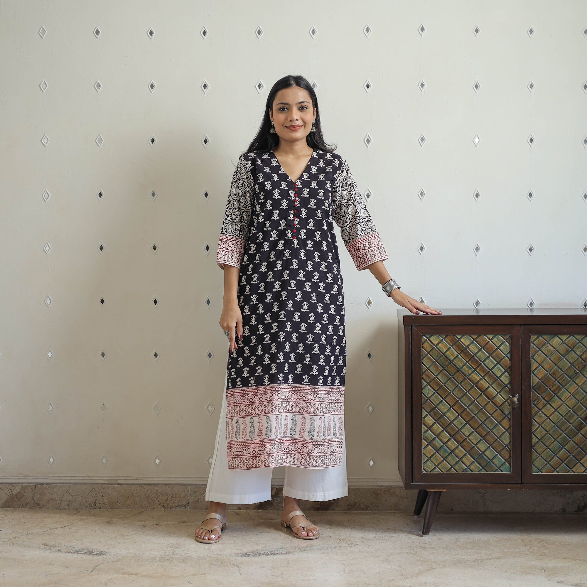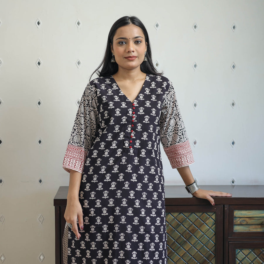 This black block print cotton straight bagh kurta brings together the traditional art of Bagh block printing and modern design. Made from natural dyed cotton, this kurta is soft on your skin and eco-friendly. It features a straight fit and a practical one-side pocket for convenience. Whether for a daily outing or a special event, this kurta offers the perfect blend of comfort and style.