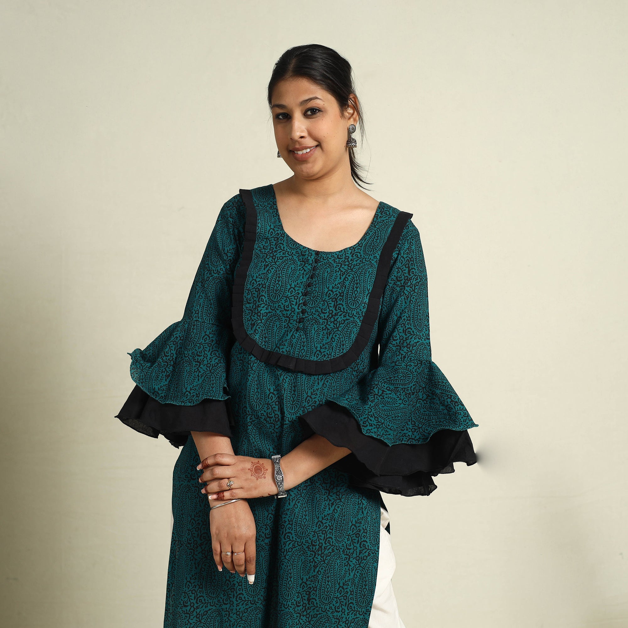 Add a cultural touch to your style with this green block print mul cotton green straight bagh kurta. Handcrafted using the traditional bagh block printing technique, each design showcases intricate and vibrant patterns. Made from soft, breathable cotton and dyed with eco-friendly natural colors, this kurta offers a seamless blend of comfort and timeless elegance. Featuring a convenient side pocket, it’s perfect for casual outings or festive moments an essential addition to your wardrobe.