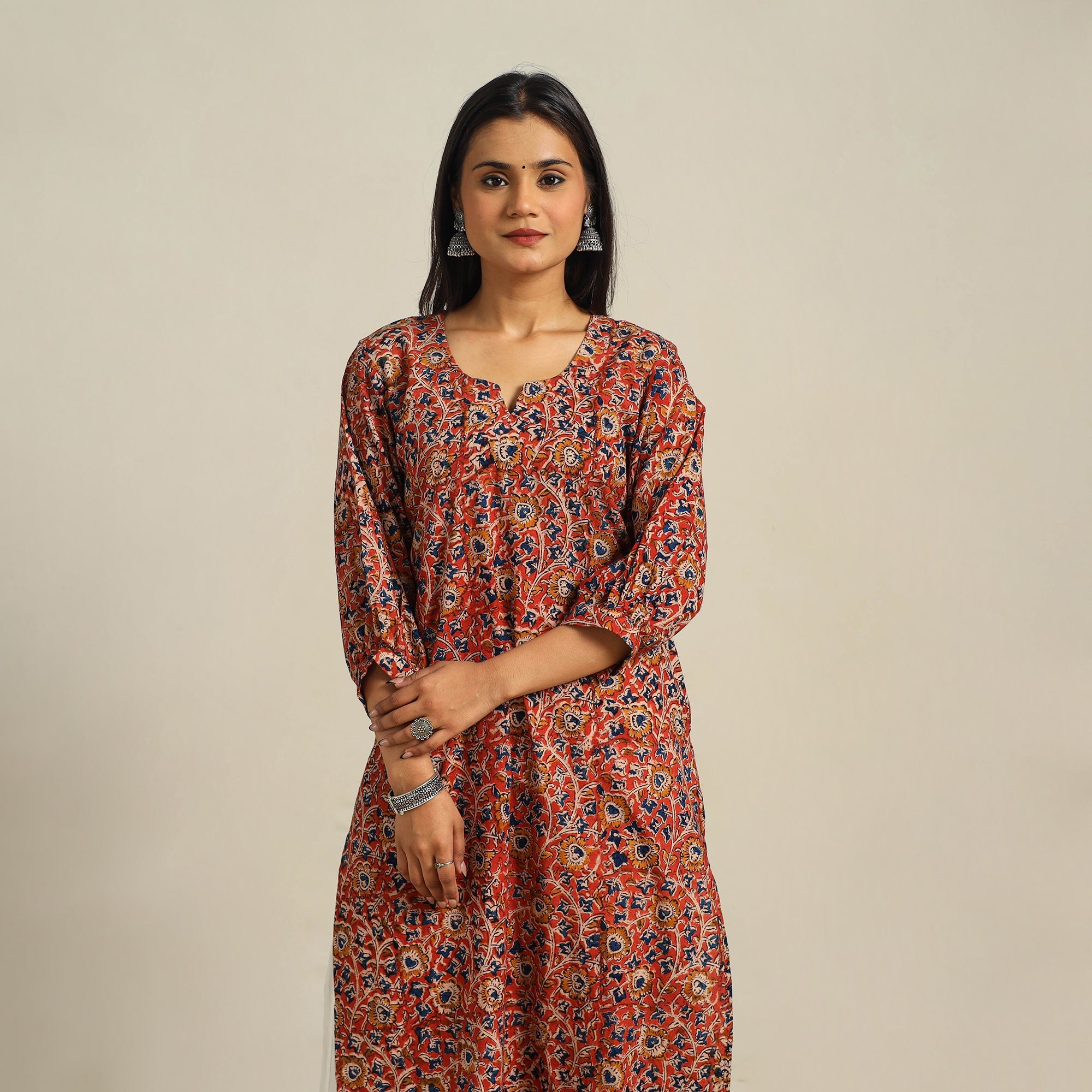 Crafted from soft cotton, this straight-fit red kalamkari kurta features traditional hand block prints made using natural dyes. The artwork reflects cultural storytelling rooted in generations of skilled artisans. A relaxed fit and single side pocket enhance everyday comfort. Whether it’s for casual wear or a festive moment, it’s both graceful and easygoing.