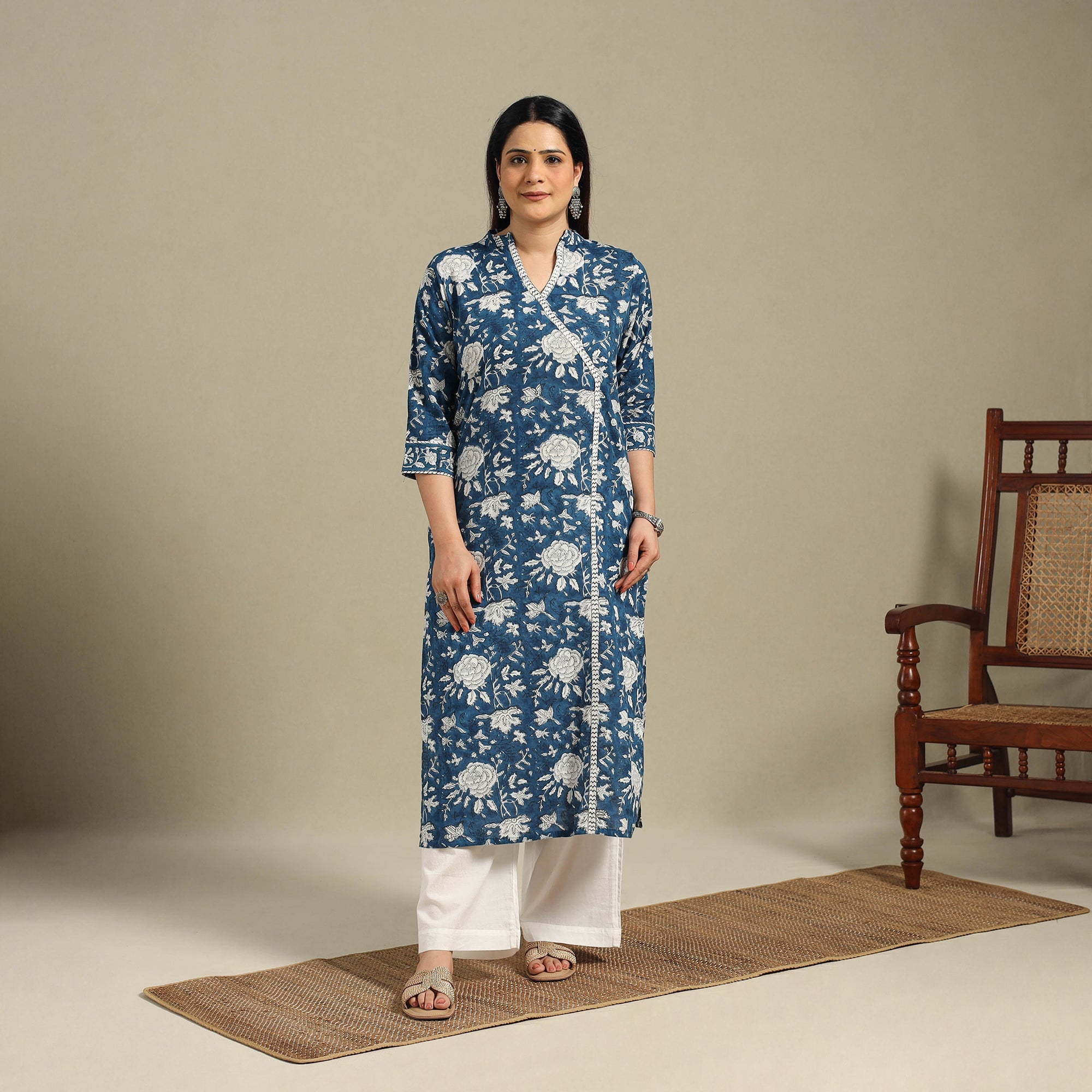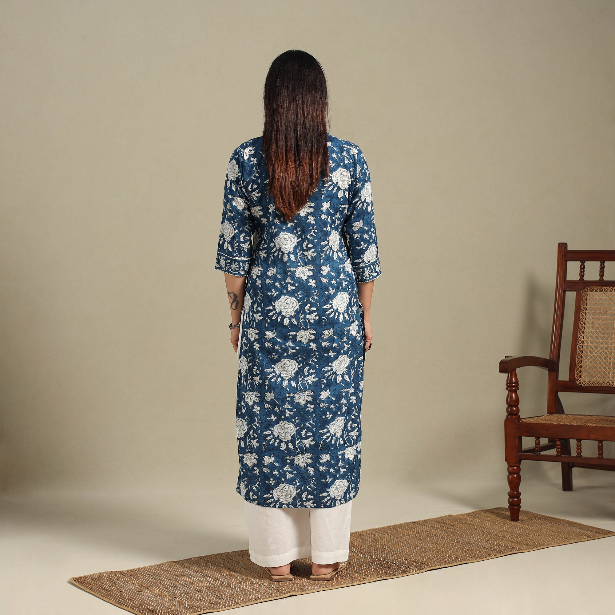 This blue sanganeri block-printed straight kurta is made from soft, breathable cotton. It features a side pocket and floral motifs created using traditional wooden blocks from Sanganer. Perfect for daily wear, office looks, festive moments, or travel, this kurta blends comfort with effortless style.