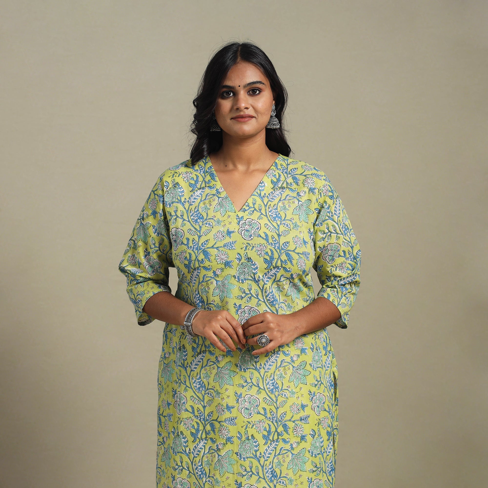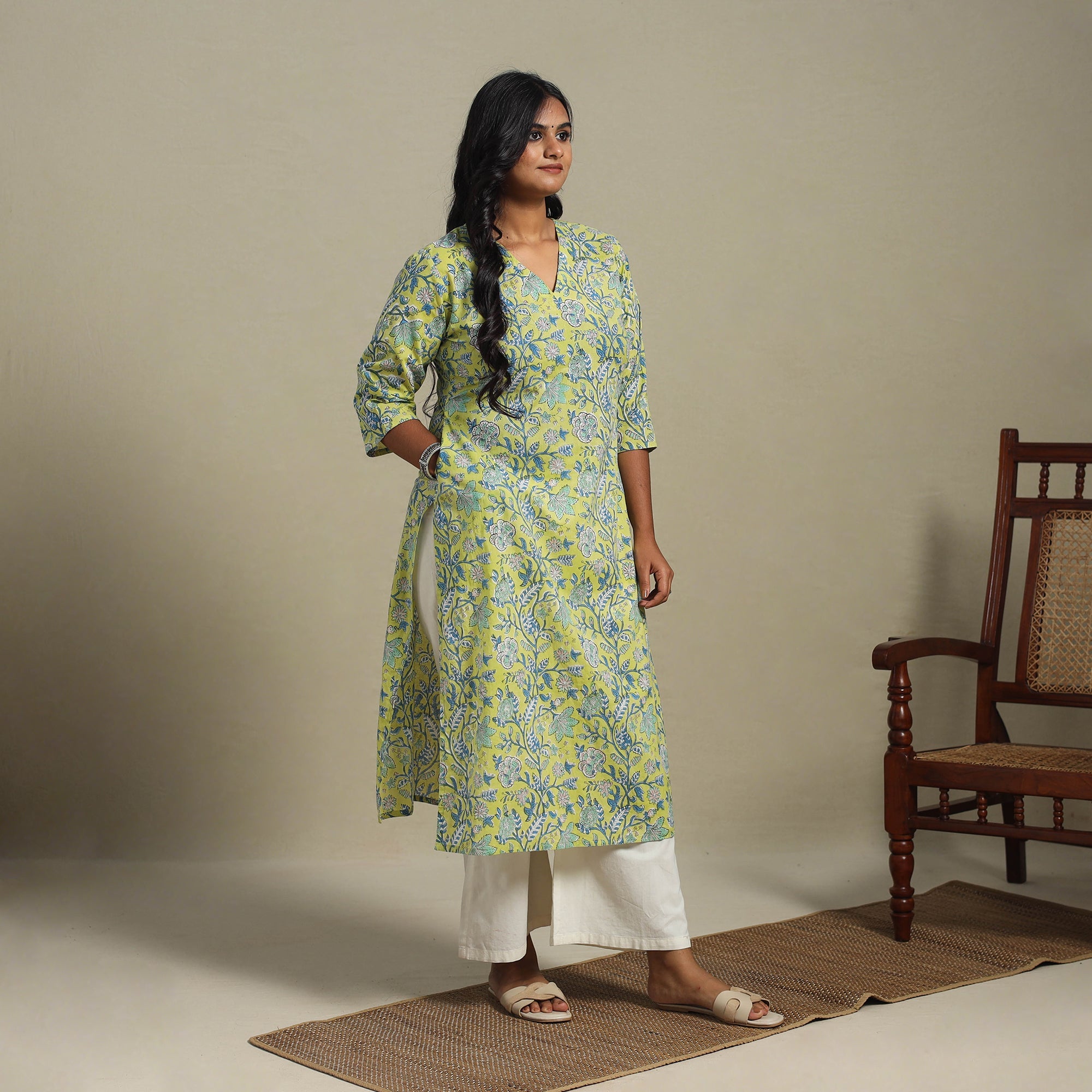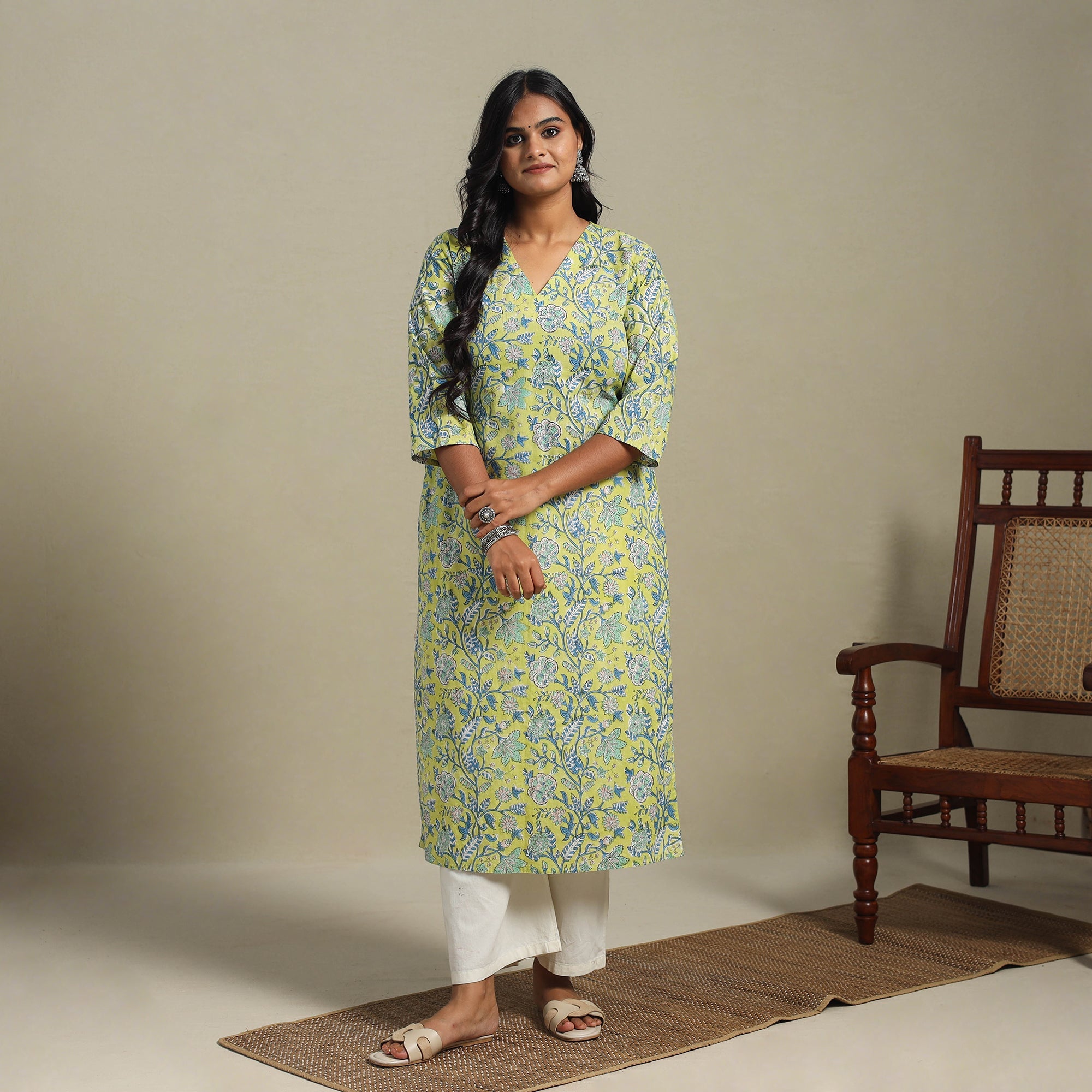 Embrace the charm of this green hand block printed cotton straight sanganeri kurta, crafted by skilled artisans. Made from breathable cotton, it ensures all-day comfort, while the elegant sanganeri print adds a touch of artistry. With a convenient side pocket and a relaxed fit, this kurta is ideal for both casual outings and special occasions.