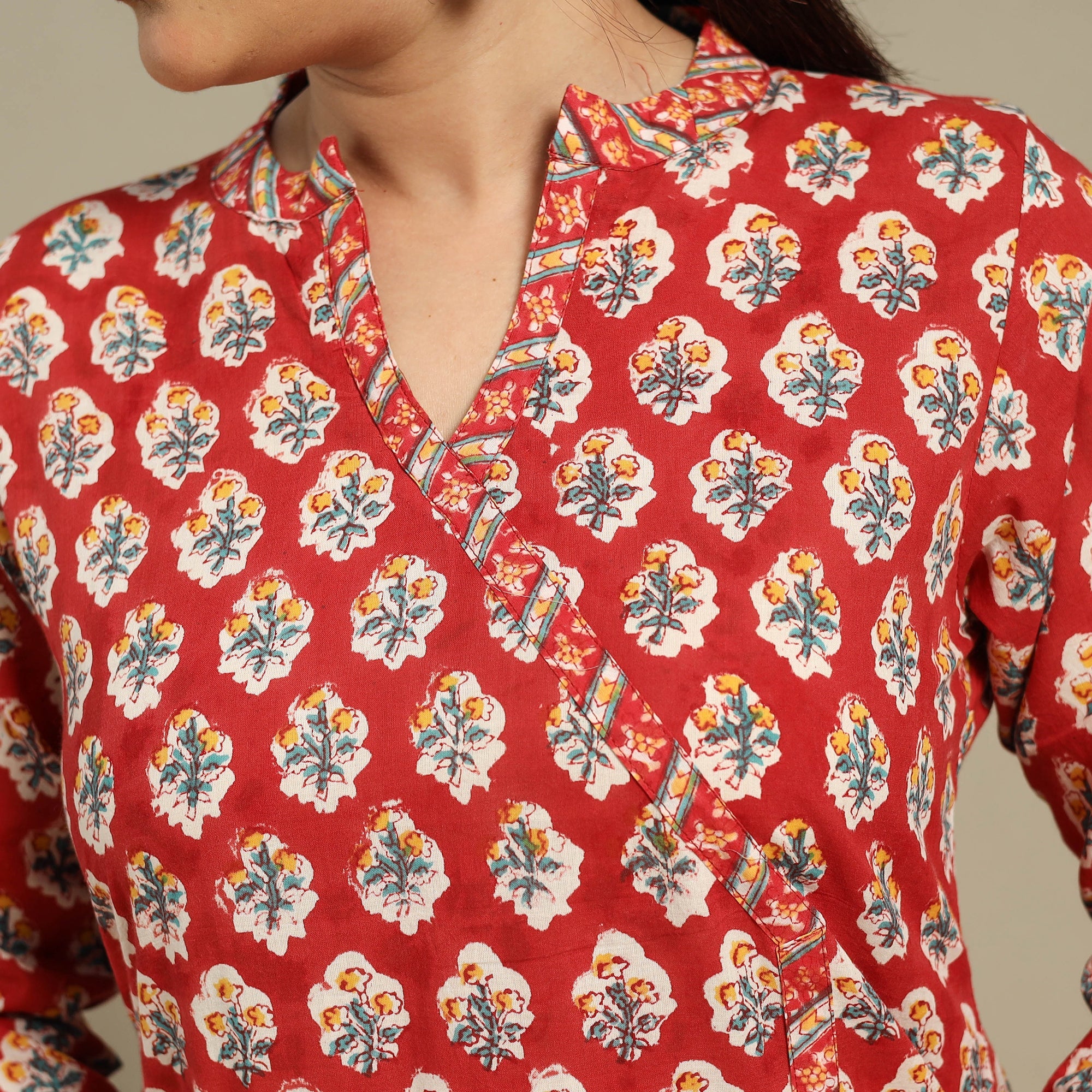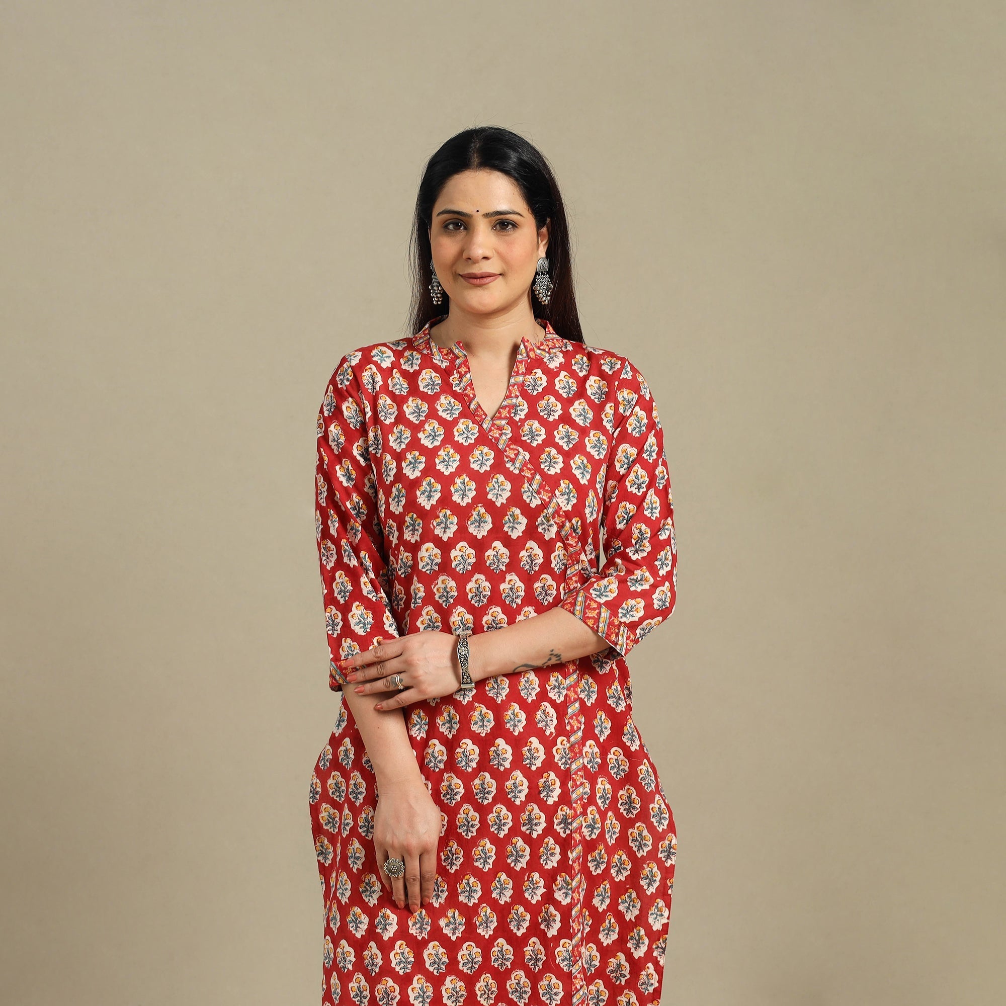 This red sanganeri block-printed straight kurta is made from soft, breathable cotton. It features a side pocket and floral motifs created using traditional wooden blocks from Sanganer. Perfect for daily wear, office looks, festive moments, or travel, this kurta blends comfort with effortless style.