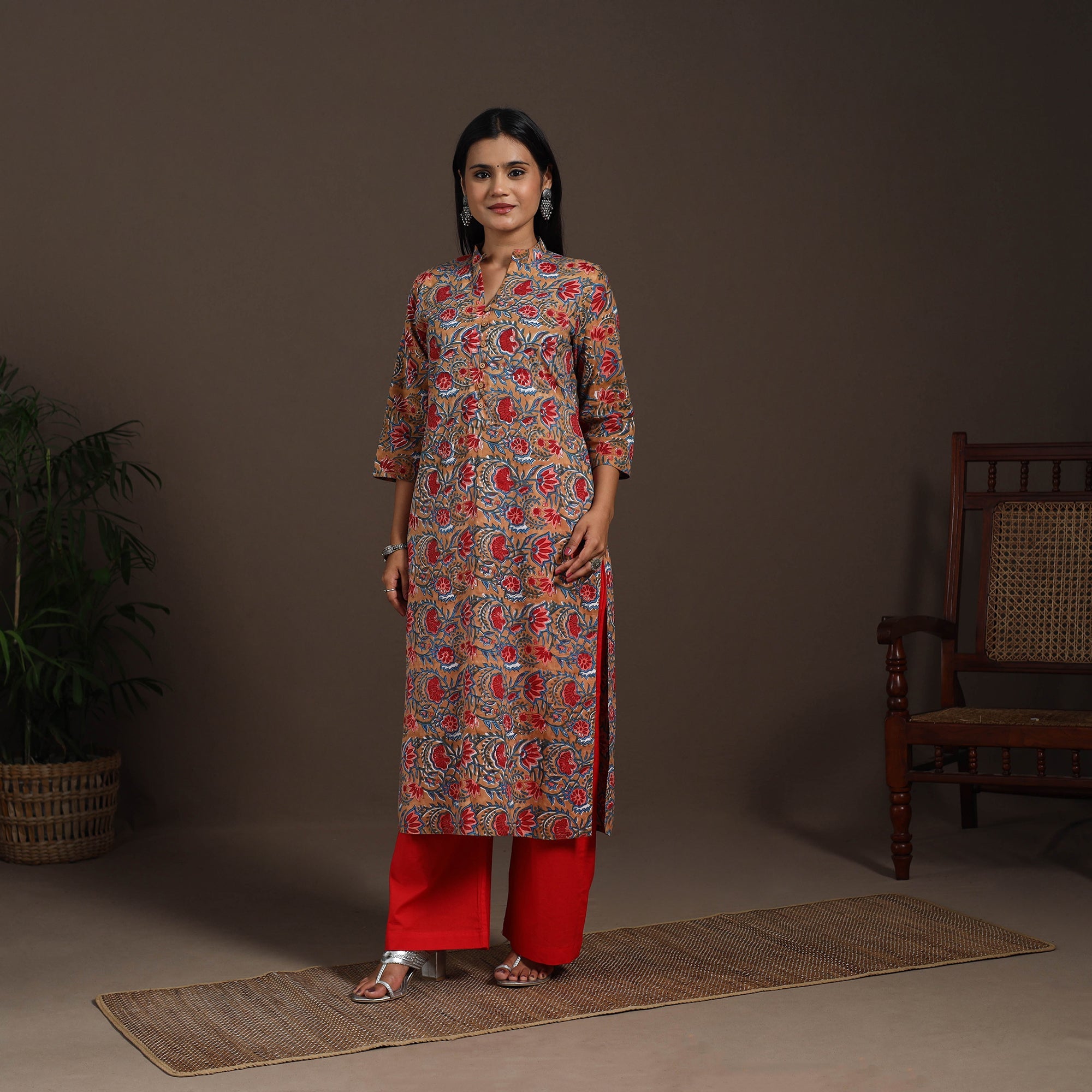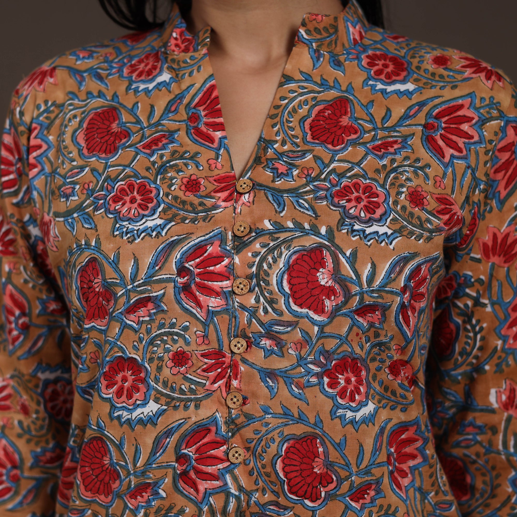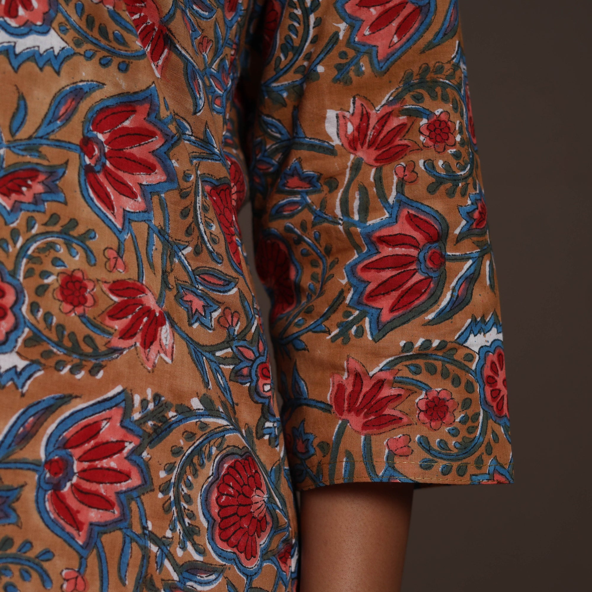Look effortlessly elegant in this brown sanganeri block print straight kurta. Made from soft cotton, it features delicate floral motifs inspired by the traditional printing craft of Sanganer, Rajasthan. Designed with a relaxed fit and a handy side pocket, it’s ideal for both casual outings and small gatherings. Add a touch of timeless grace to your everyday style with this beautifully crafted kurta.