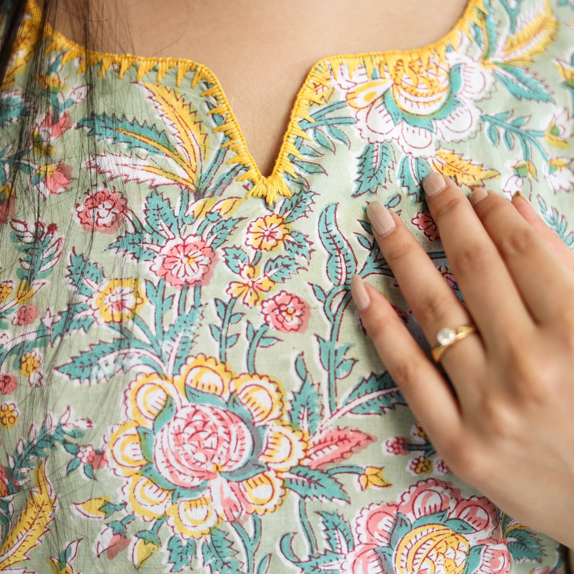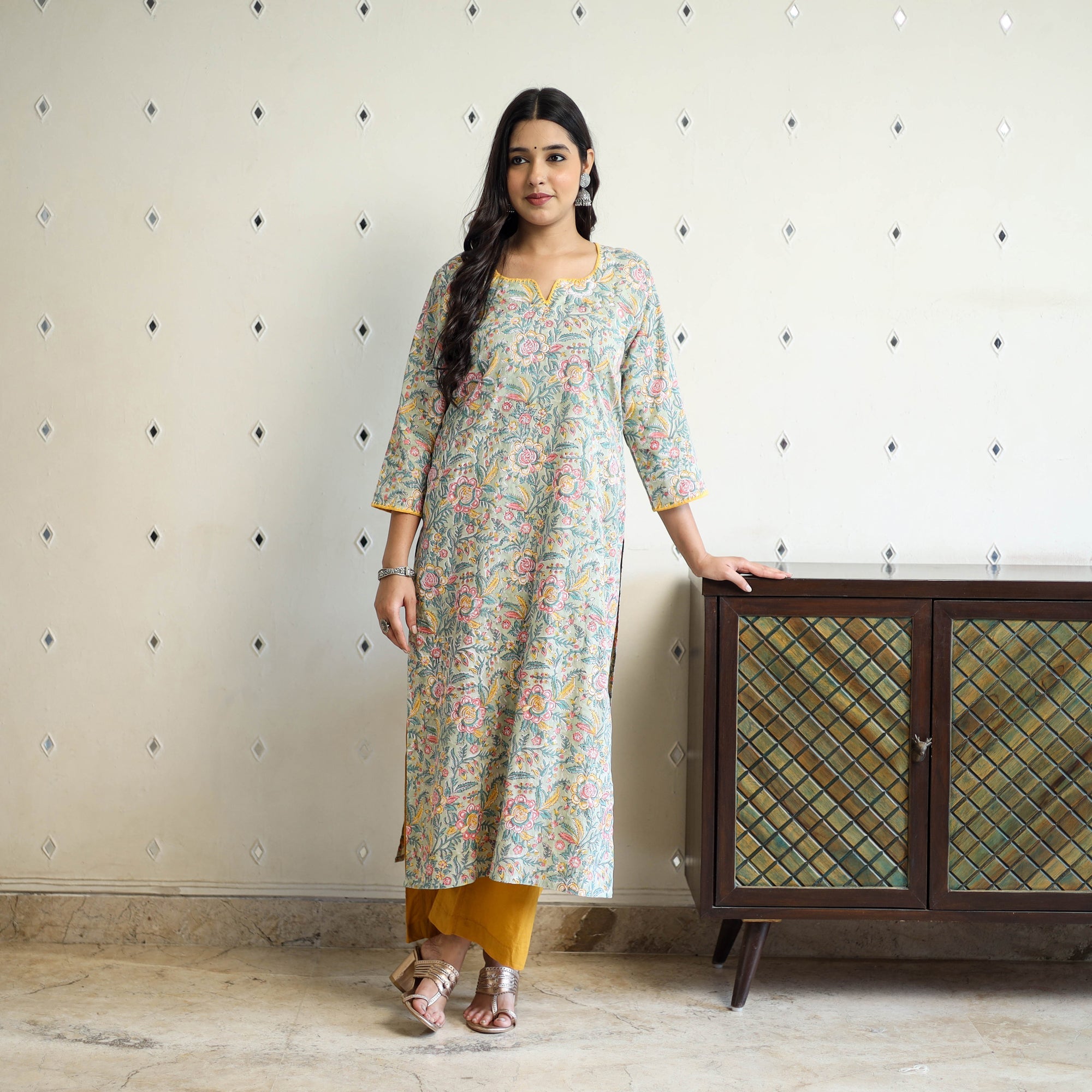 This grey block-printed straight sanganeri cotton kurta is crafted from breathable cotton and detailed with hand embroidery. It includes a functional side pocket. The floral motifs are printed using traditional wooden blocks, a heritage craft of Sanganer. Ideal for both casual outings and festive occasions.
