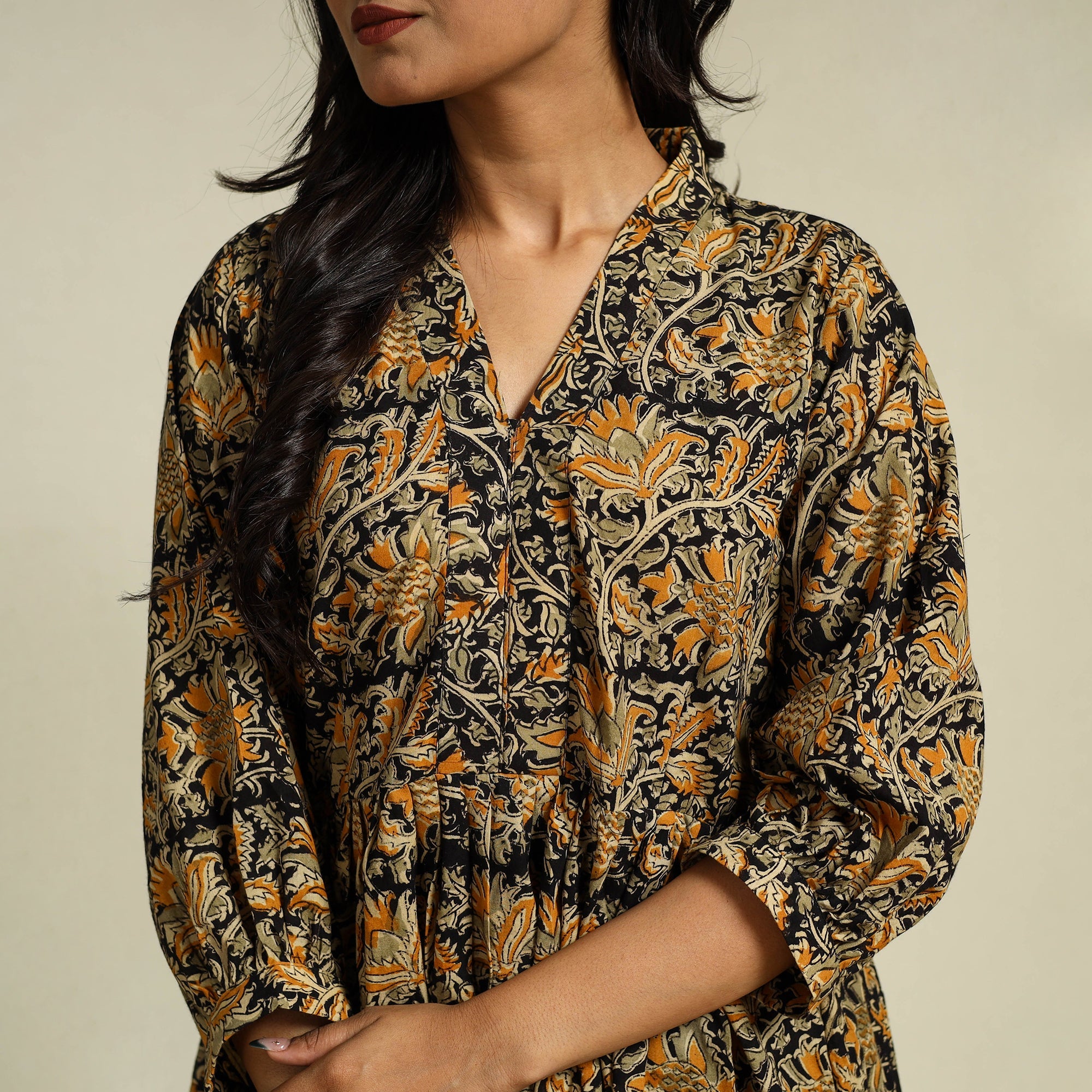 This black block-printed cotton kalamkari dress blends tradition with comfort. Crafted from naturally dyed fabric, it feels soft and breathable throughout the day. The tiered silhouette enhances its shape, making it ideal for wearing at home, during family gatherings, casual outings, or as a meaningful gift for someone special.