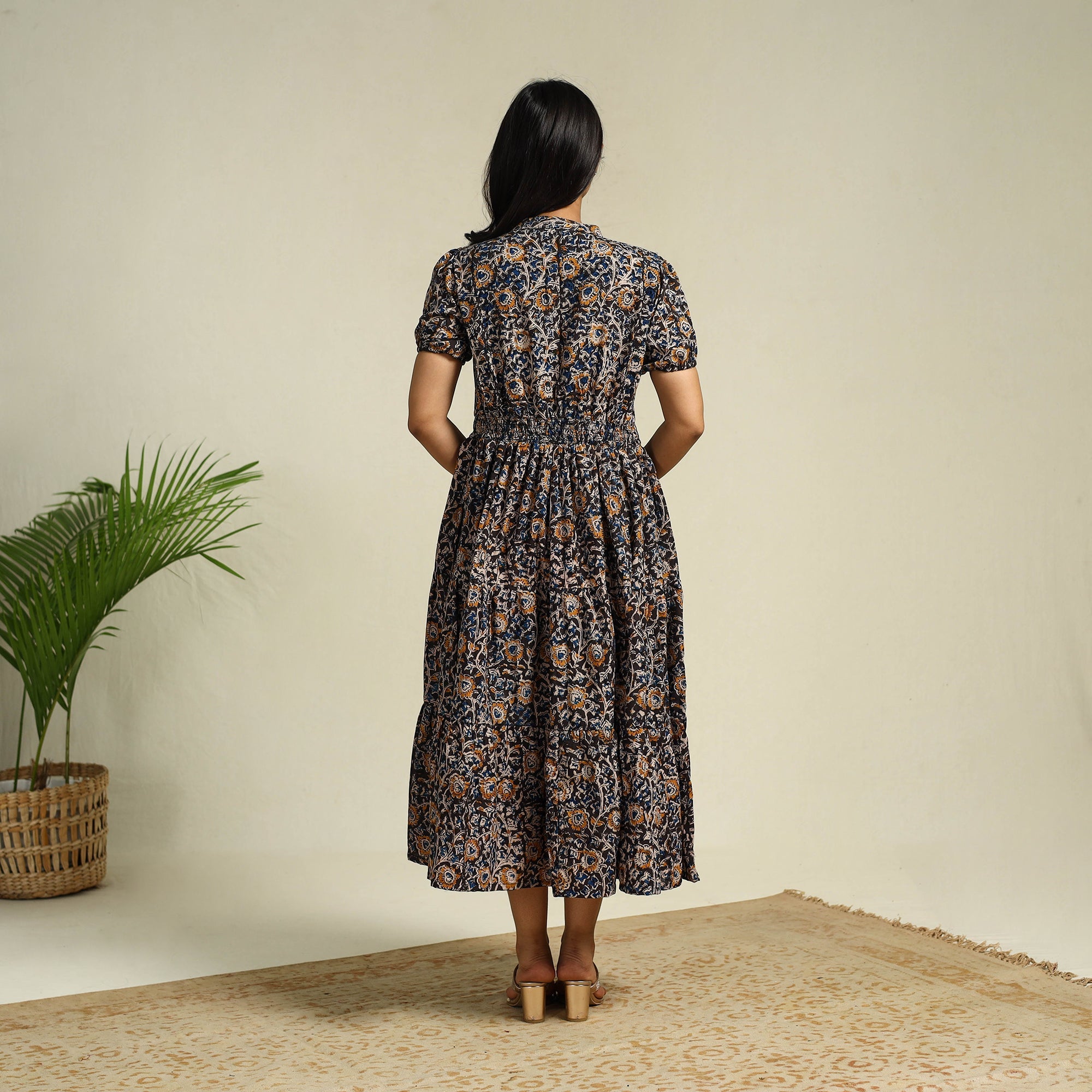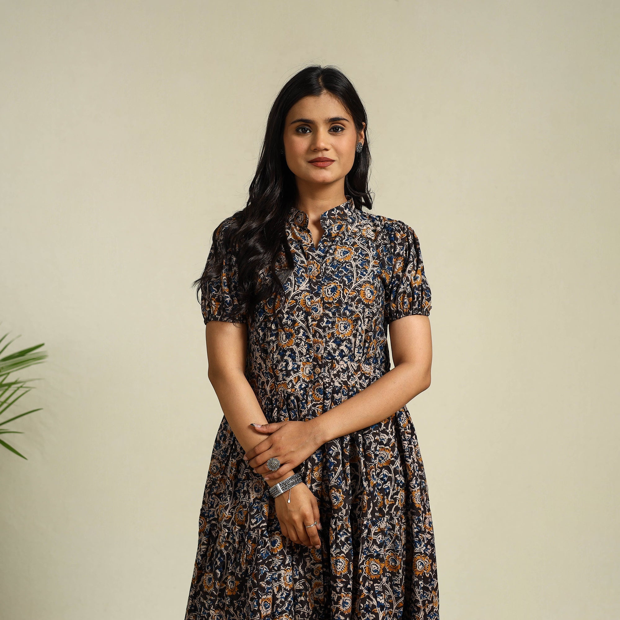 This black block-printed cotton kalamkari dress blends tradition with comfort. Made from naturally dyed fabric, it feels soft and breathable all day. The button-down front and tiered design lend it a graceful silhouette, making it ideal for wearing at home, family gatherings, small outings, or as a thoughtful gift for someone special.