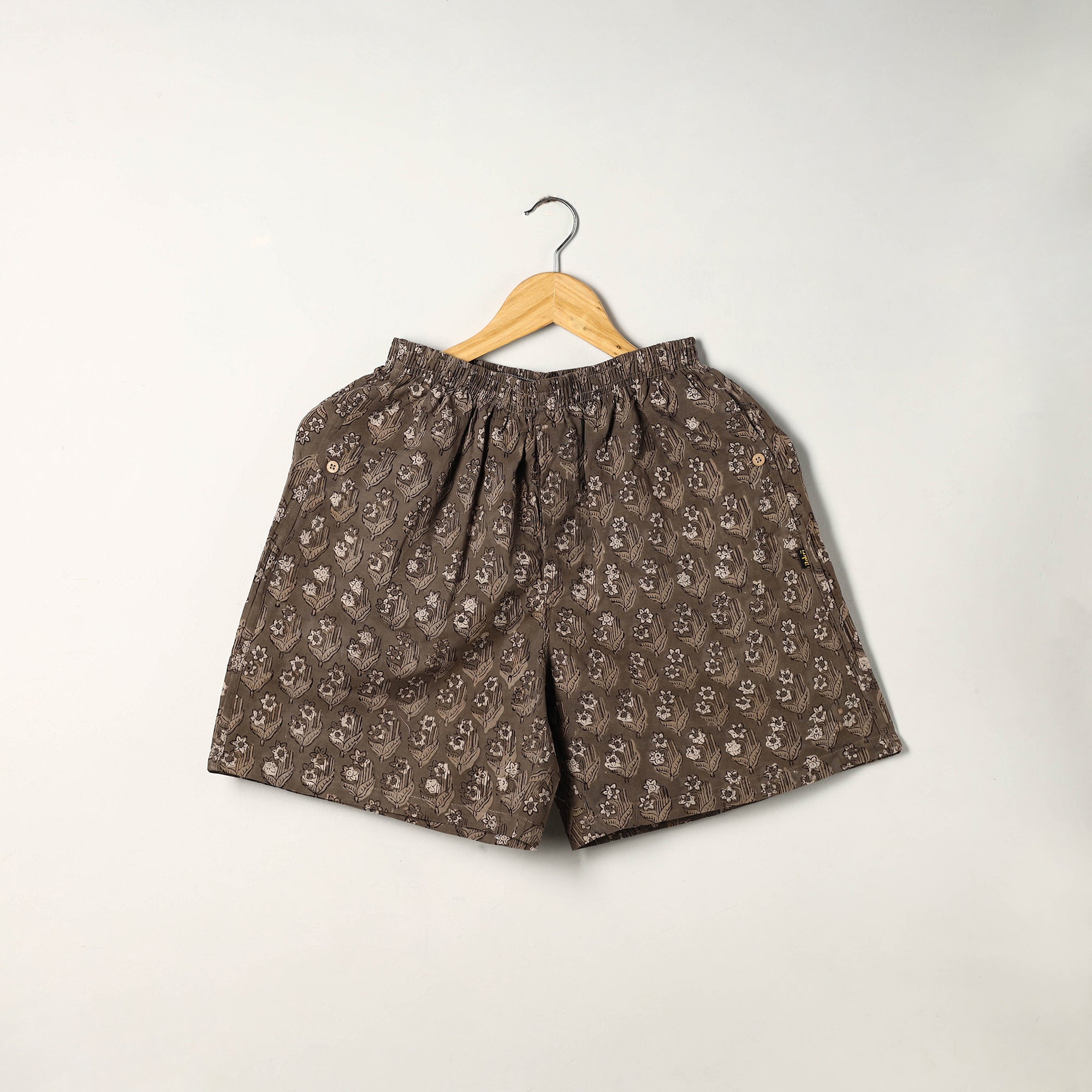 Block print cotton unisex brown bagru shorts/boxer are a blend of tradition and comfort, and handcrafted by skilled artisans using the bagru block printing technique. Featuring soft fabric, a durable waistband, and side pockets, these shorts offer breathability and style for everyday wear. They are also suitable for sleeping and lounging, making them a versatile addition to your wardrobe.