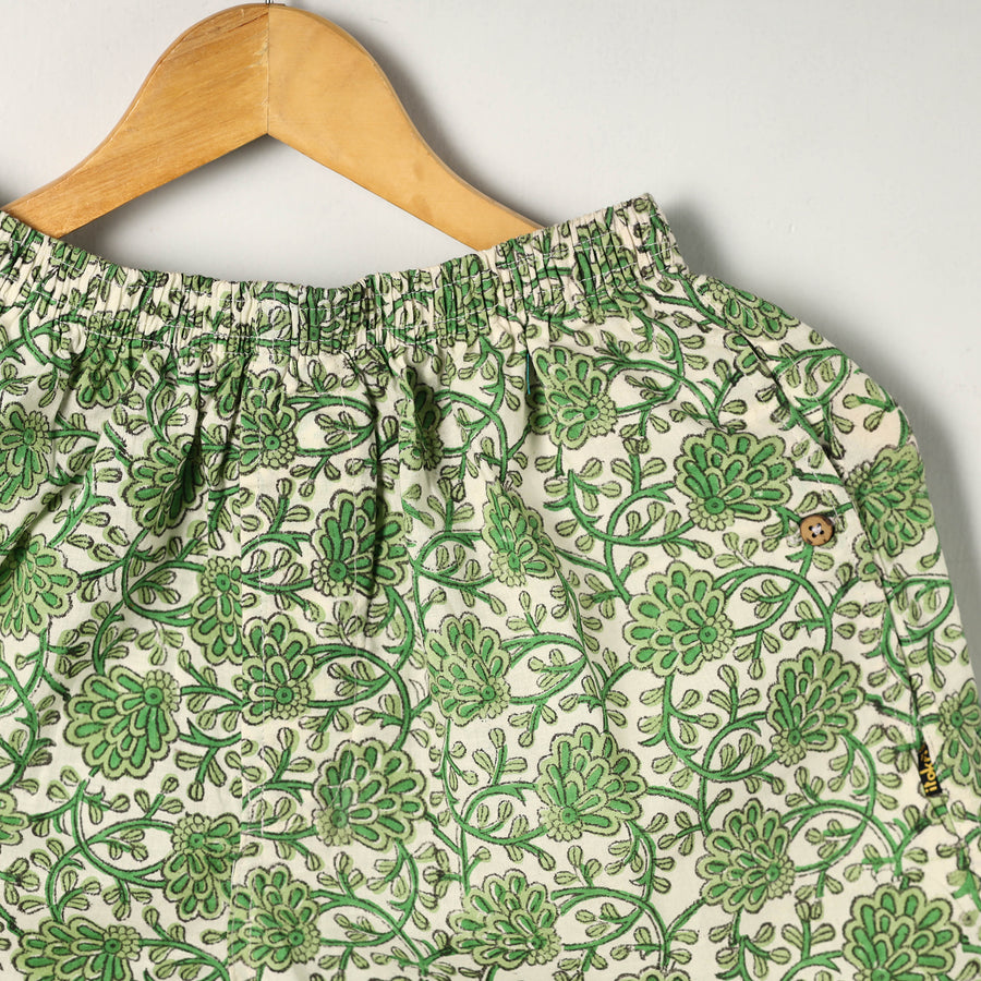Block print cotton unisex green sanganeri shorts/boxers are a blend of tradition and comfort, handcrafted by skilled artisans using the centuries-old Sanganeri block printing technique. Featuring soft fabric, a durable waistband, and side pockets, these shorts offer breathability and style for everyday wear. They are also suitable for sleeping and lounging, making them a versatile addition to your wardrobe.