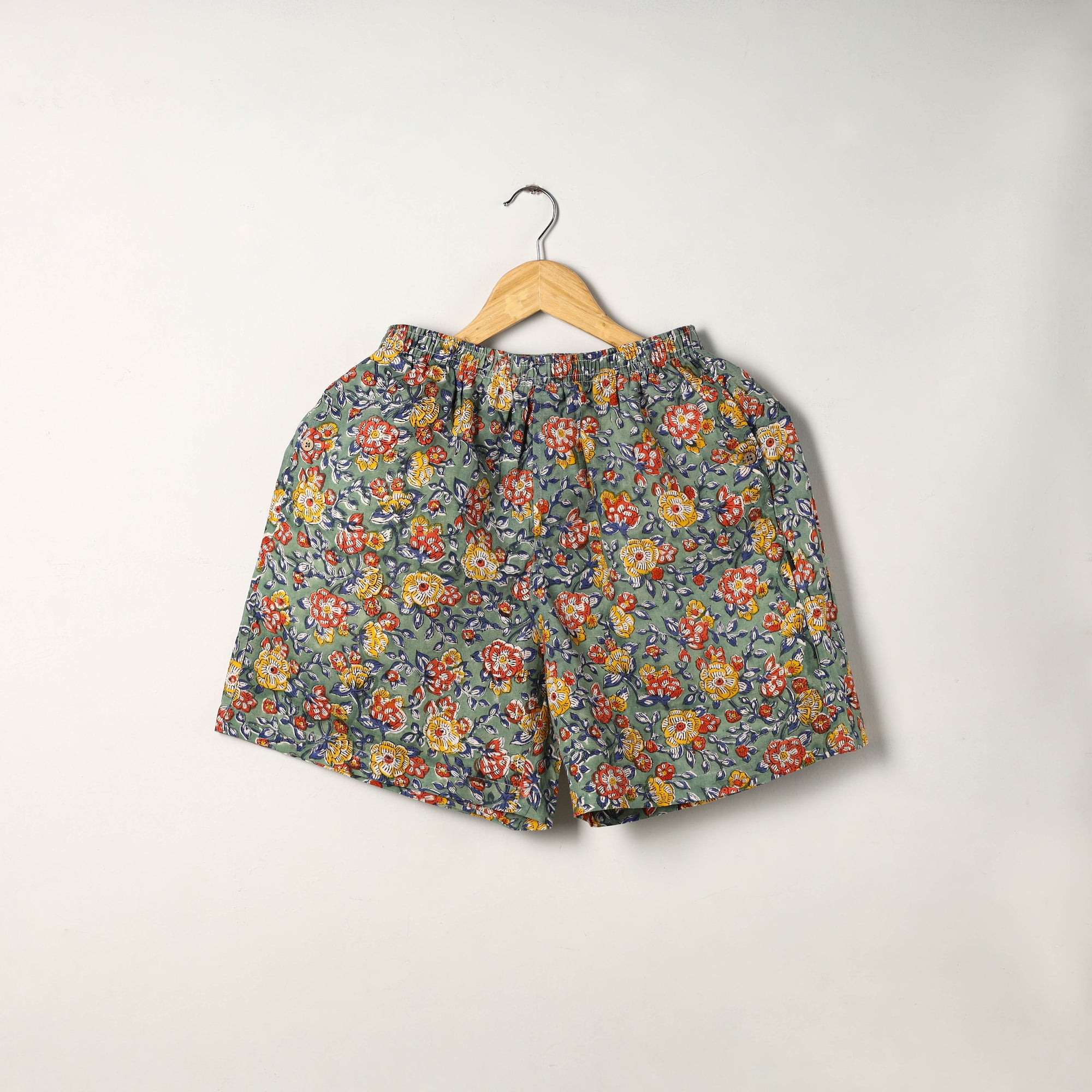 Block print cotton unisex green sanganeri shorts/boxers are a blend of tradition and comfort, handcrafted by skilled artisans using the centuries-old Sanganeri block printing technique. Featuring soft fabric, a durable waistband, and side pockets, these shorts offer breathability and style for everyday wear. They are also suitable for sleeping and lounging, making them a versatile addition to your wardrobe.