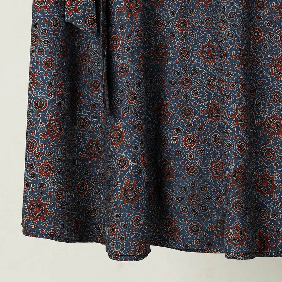 Enhance your wardrobe with our blue block print cotton wrap around ajrakh skirt, handcrafted by skilled artisans in the Kutch region of Gujarat. Featuring a wrap-around style with a waist tie closure, this skirt is made using eco-friendly natural dyes and traditional Ajrakh block printing techniques. Its breathable cotton fabric ensures comfort, perfect for casual outings.