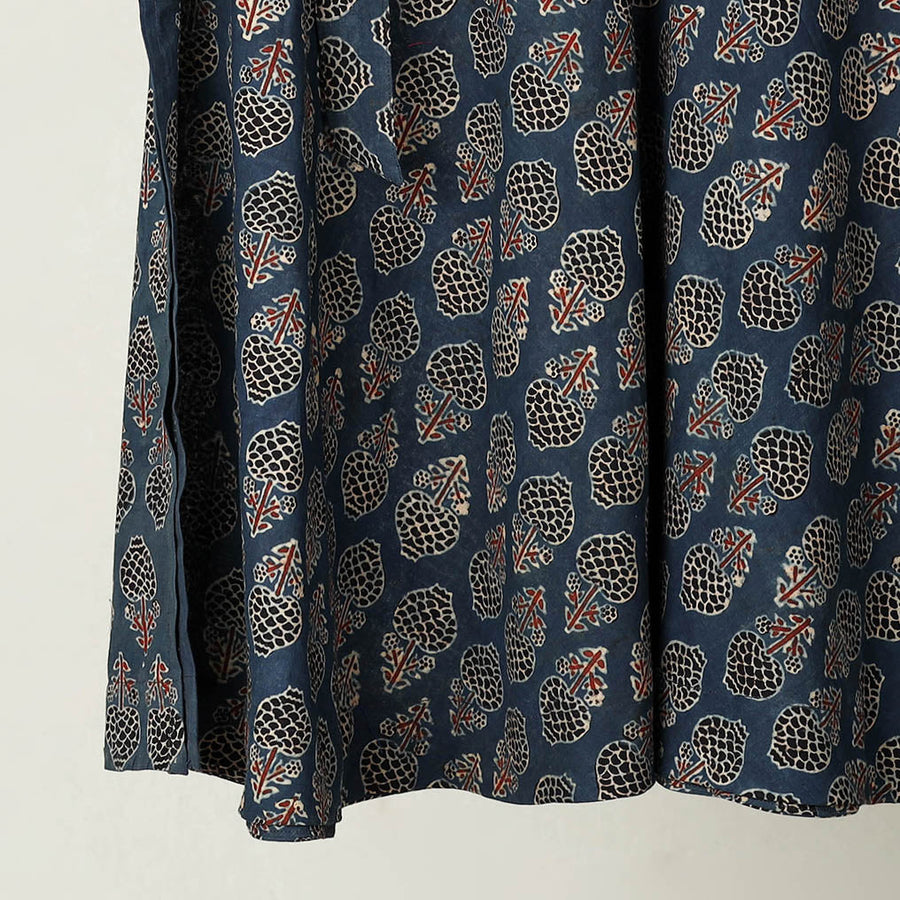 Enhance your wardrobe with our blue block print cotton wrap around ajrakh skirt, handcrafted by skilled artisans in the Kutch region of Gujarat. Featuring a wrap-around style with a waist tie closure, this skirt is made using eco-friendly natural dyes and traditional Ajrakh block printing techniques. Its breathable cotton fabric ensures comfort, perfect for casual outings.