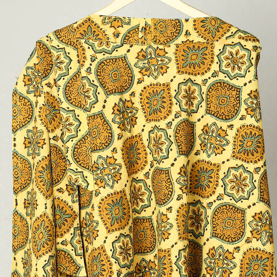 Enhance your wardrobe with our yellow block print cotton wrap around ajrakh skirt, handcrafted by skilled artisans in the Kutch region of Gujarat. Featuring a wrap-around style with a waist tie closure, this skirt is made using eco-friendly natural dyes and traditional Ajrakh block printing techniques. Its breathable cotton fabric ensures comfort, perfect for casual outings.