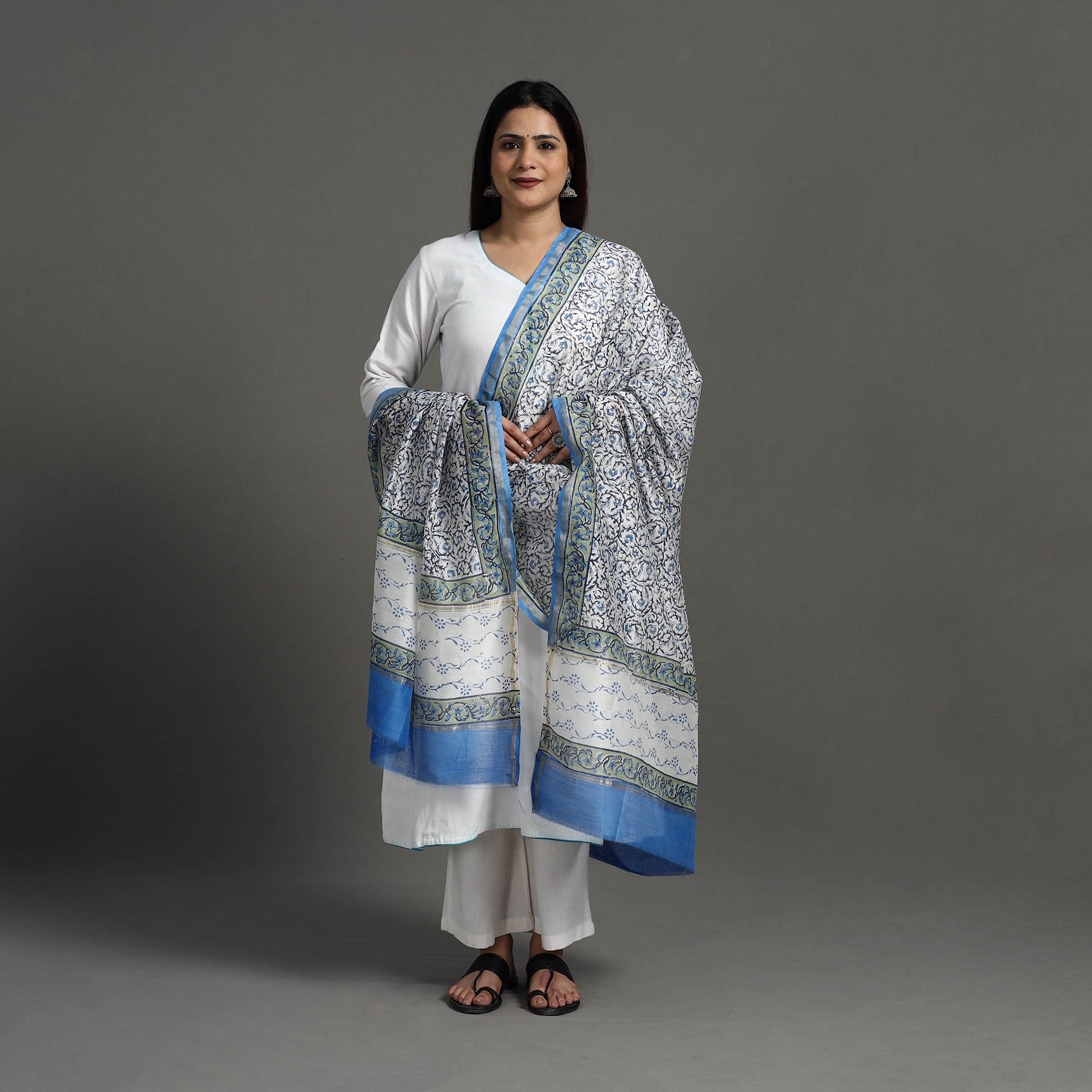 Hand block print handloom chanderi silk blue sanganeri dupatta. Adorned with floral block prints and a zari border, it embodies timeless elegance and skilled craftsmanship. This chanderi silk cotton dupatta luxurious and vibrant, bleed-free dyes make it ideal for both festive and everyday wear.