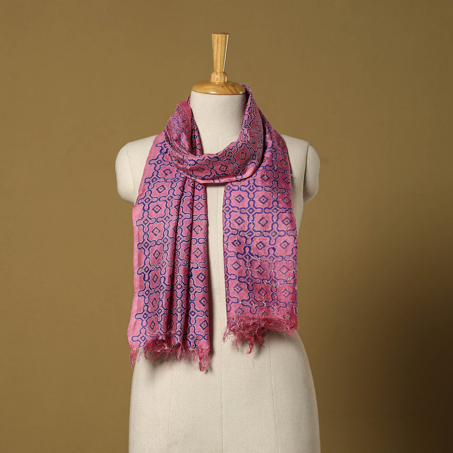 Pink bengal kantha tussar silk handloom stole featuring block-printed designs, enhanced with traditional kantha hand embroidery from West Bengal. This piece beautifully blends cultural heritage with contemporary motifs, making it a versatile accessory for both ethnic and modern outfits.