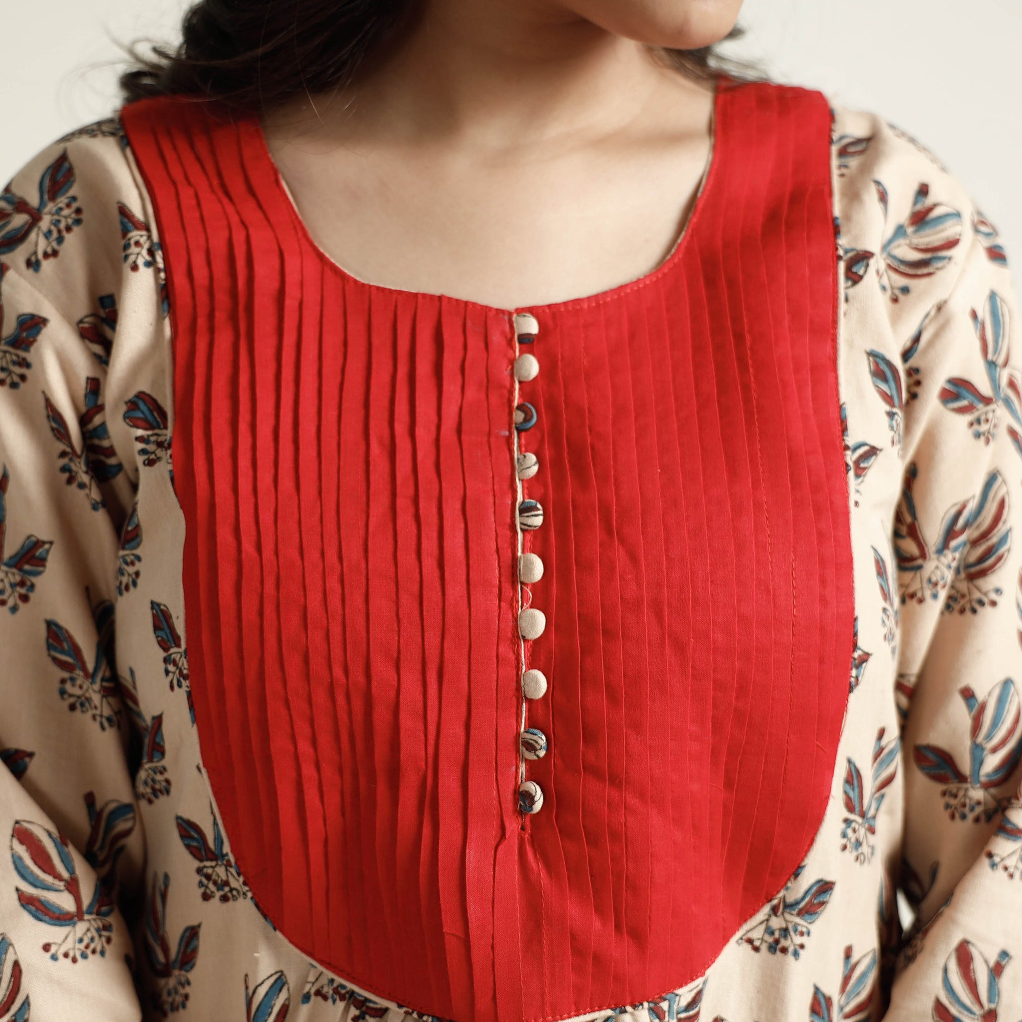 Look and feel beautiful in this uniquely designed beige block print handwoven cotton a-line mangalagiri side pocket patchwork kurta. This cotton kurta makes you comfortable with ease all day long. Perfect for both daily outings and special occasions, this kurta blends tradition with modern charm.
