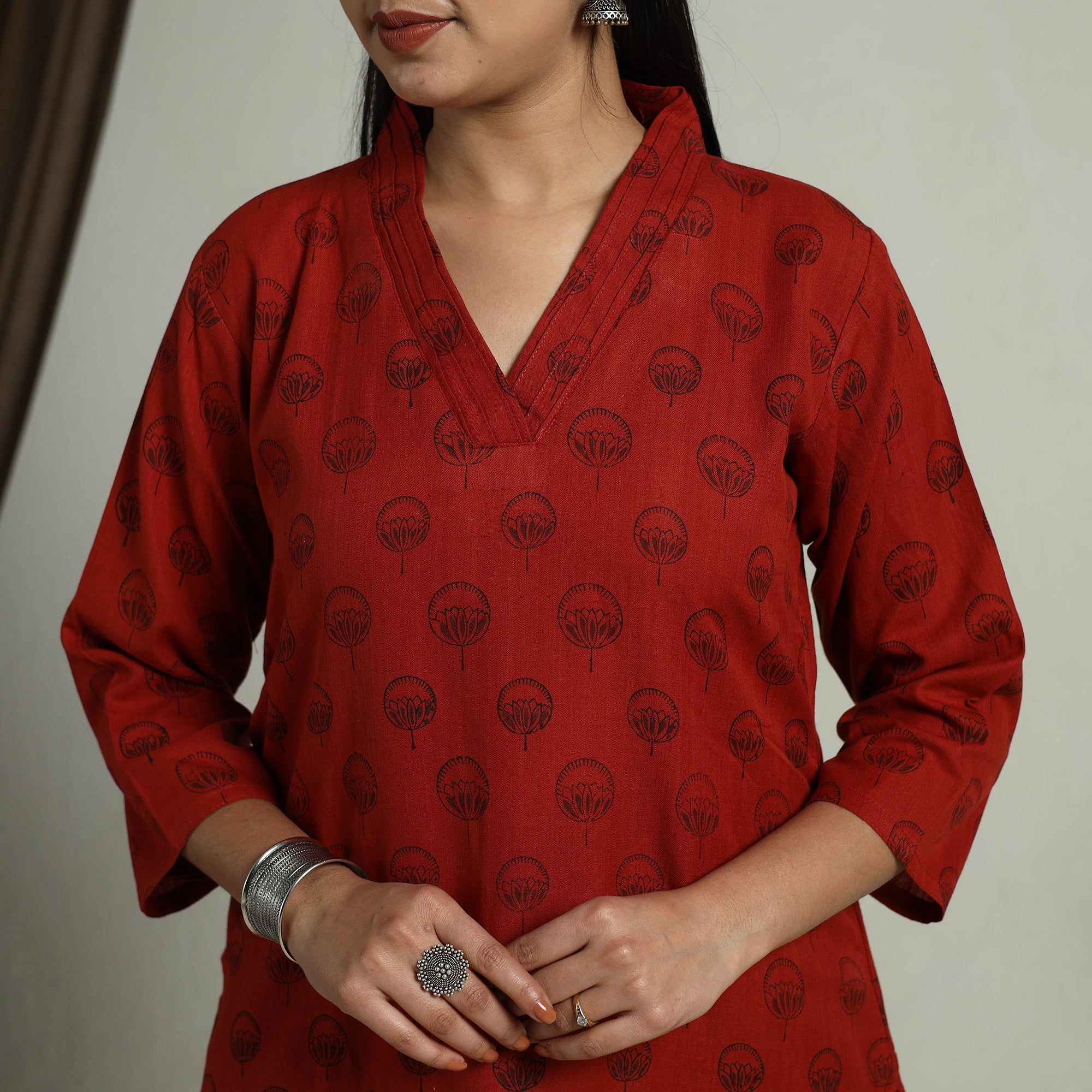 Look and feel beautiful in this uniquely designed red block print handwoven cotton straight mangalagiri side pocket kurta. This cotton kurta makes you comfortable with ease all day long. Perfect for both daily outings and special occasions, this kurta blends tradition with modern charm.