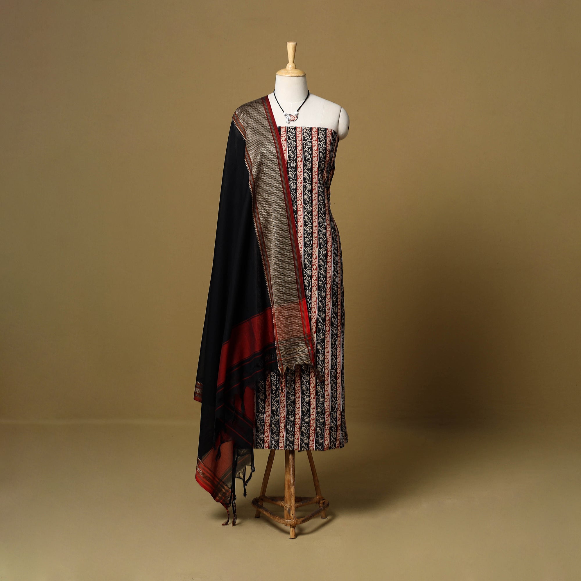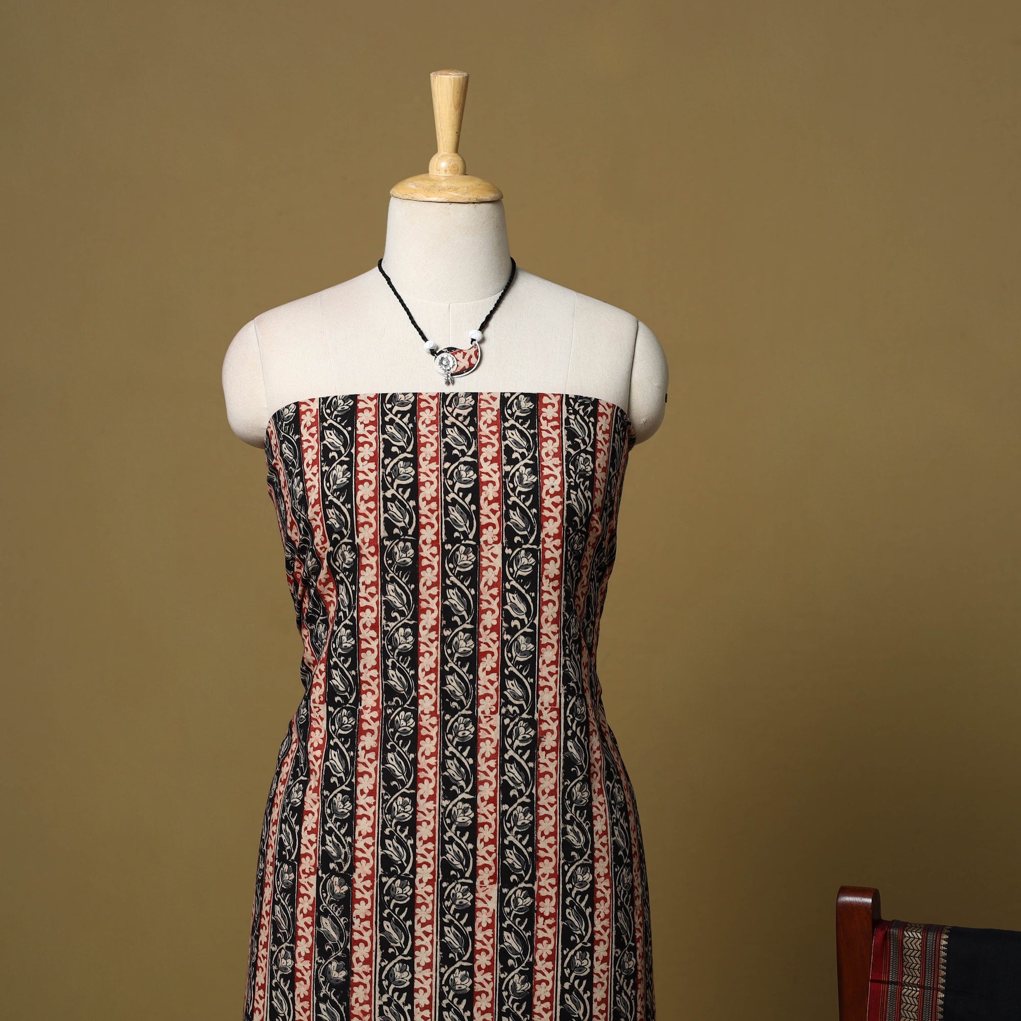 Black 2pc cotton unstitched dress material set features a kalamkari block-printed, natural-dyed kurta fabric made by artisans from Andhra Pradesh, known for one of India’s oldest textile printing traditions. It is paired with a dharwad-woven border dupatta. The set also includes a handcrafted necklace and matching earrings, making it perfect for festive events, family gatherings, special occasions or even as a thoughtful gift.