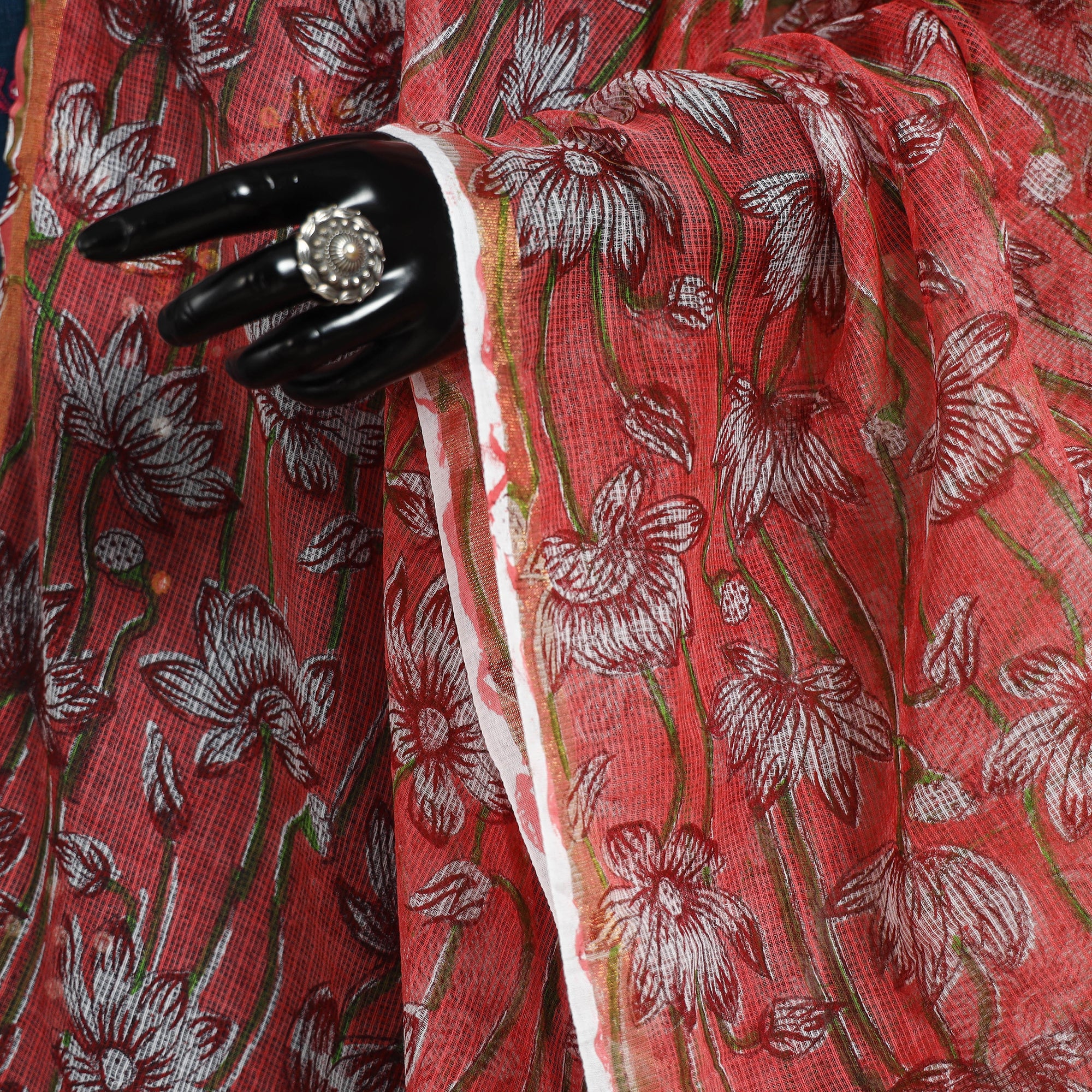 Elevate your style with our exquisite red sanganeri hand-block printed dupatta, adorned with a zari border and tassels, crafted by skilled artisans of Rajasthan. Made from a kota doria cotton and silk blend, this dupatta features vibrant motifs and is known for its airy texture and subtle transparency. Originating from the town of Sanganer, sanganeri printing is celebrated for its intricate floral patterns, perfect for both ethnic and fusion looks.red