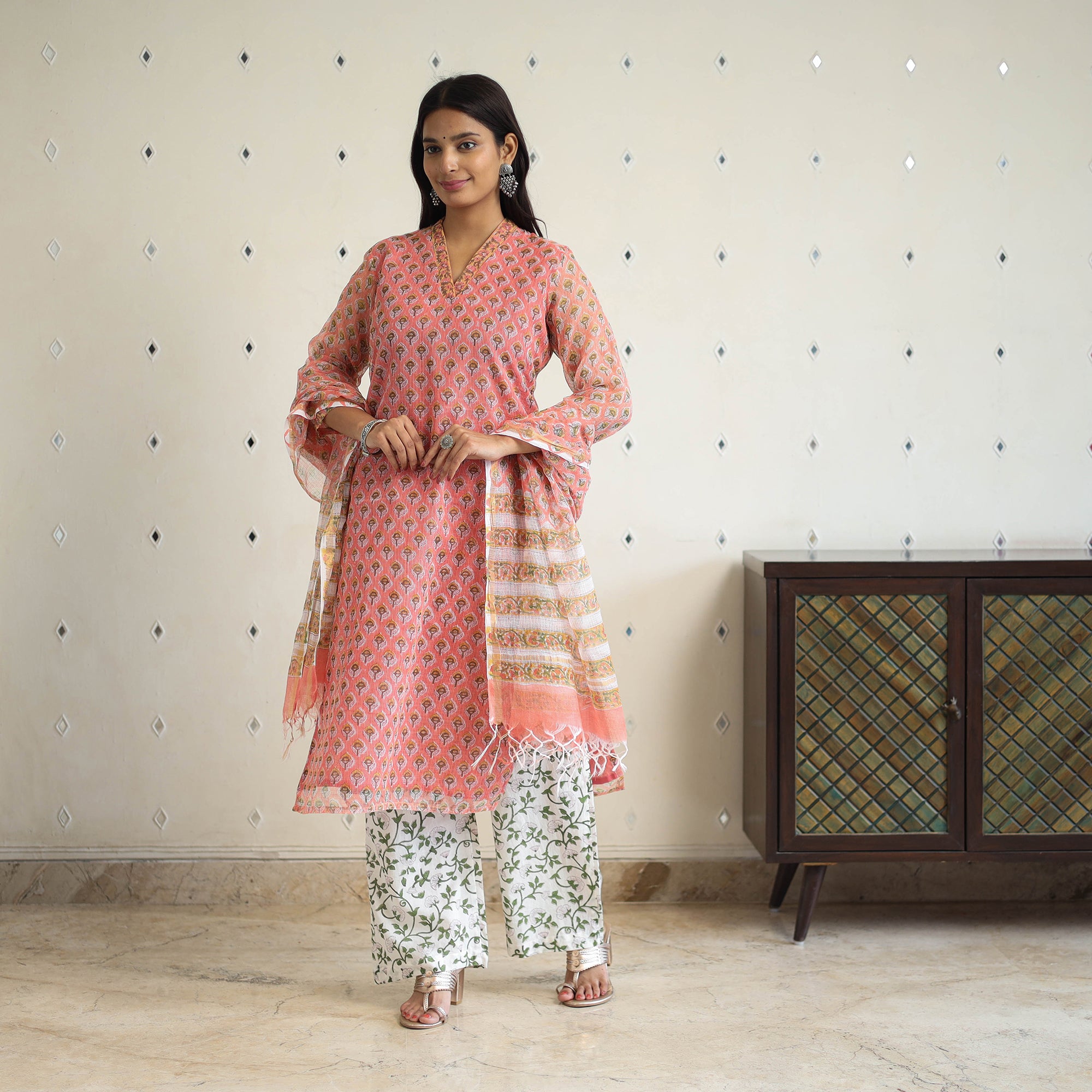 This peach block-printed kota doria cotton sanganeri kurta set features a breezy kurta with a practical side pocket and a matching palazzo with two pockets. The kurta and dupatta are crafted from airy kota doria, a lightweight cotton-silk blend, while the bottom is made from cotton for maximum comfort. Designed for everyday ease and elegance, it's a perfect pick for casual outings or festive occasions.