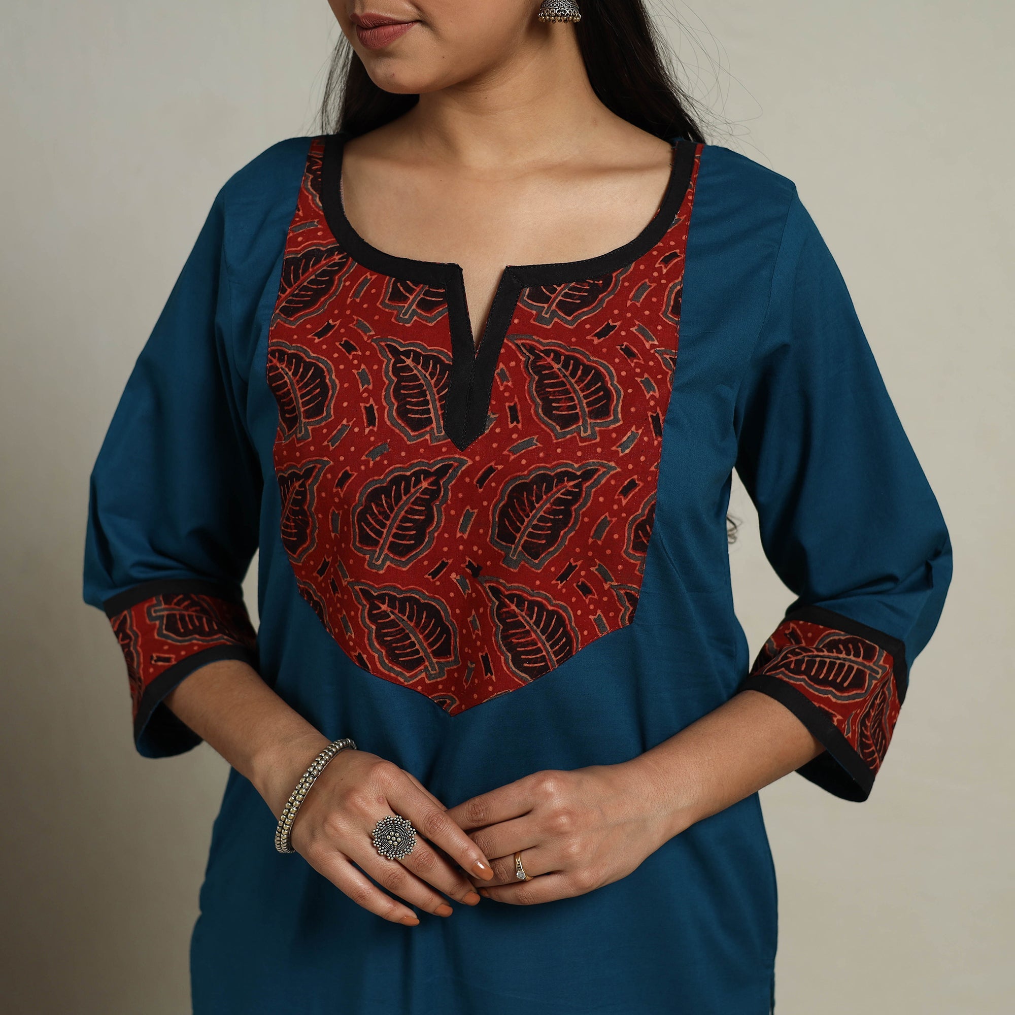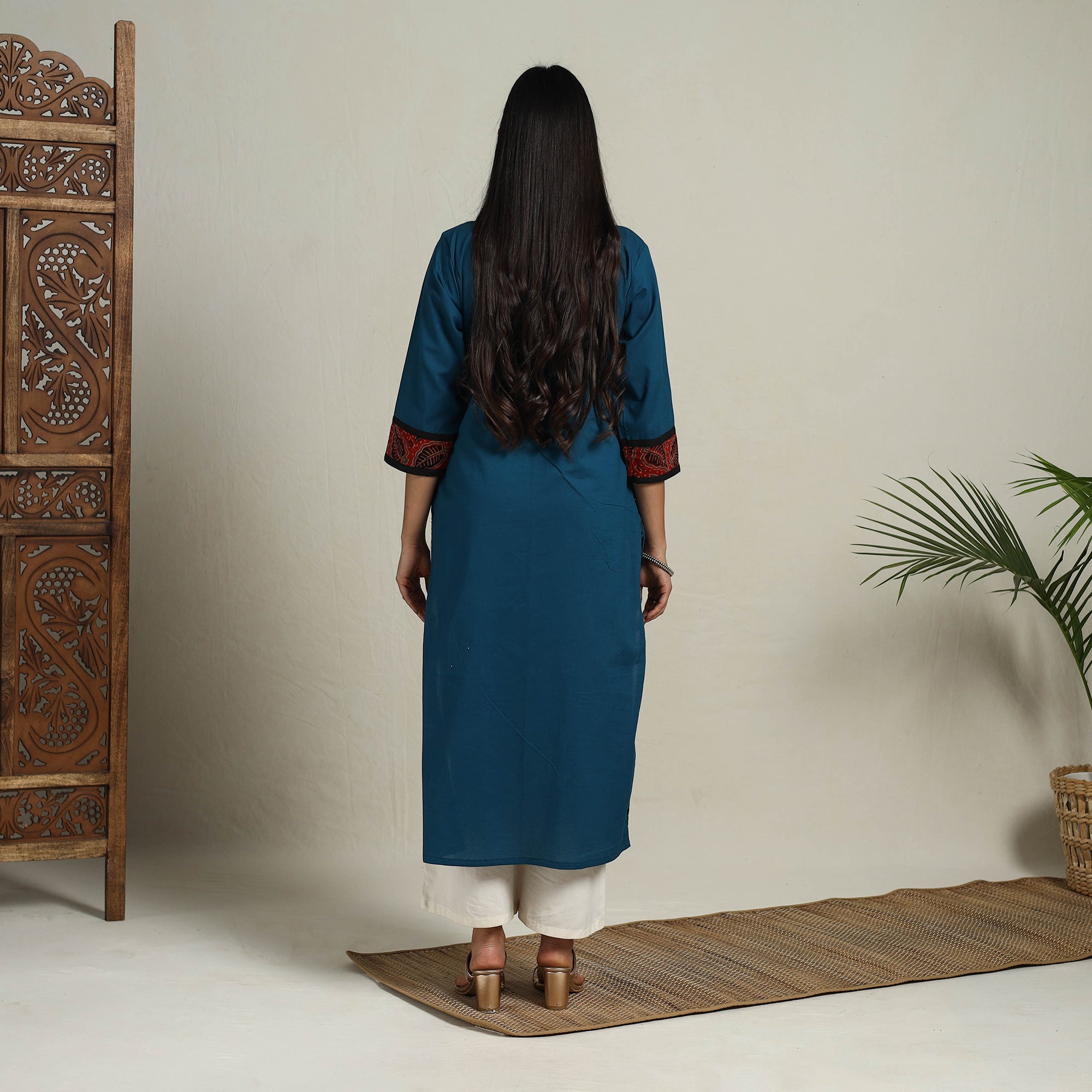 A stylish blend of tradition and modern aesthetics, this block print mosaic fusion straight teal blue plain cotton kurta. Designed for comfort and elegance, its a-line design offers a flattering fit. The kurta also features a convenient one-side pocket, perfect for carrying small essentials. It's an ideal choice for both casual and festive occasions.