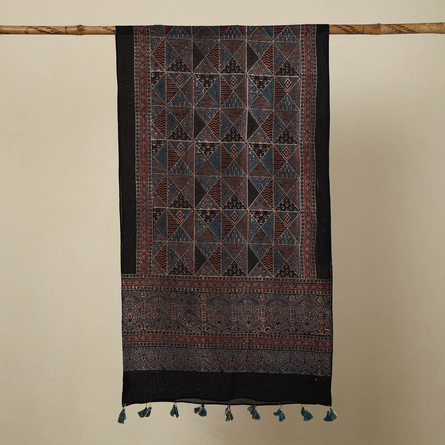 Enhance your wardrobe with this exquisite black block print mul cotton ajrakh stole, adorned with delicate tassels. Created using the traditional ajrakh hand block printing technique by master artisan Sufiyan Khatri from the Kutch region of Gujarat, this stole showcases intricate motifs crafted with natural dyes. Its versatile design effortlessly complements both ethnic and modern ensembles, making it a timeless and elegant accessory for any occasion.